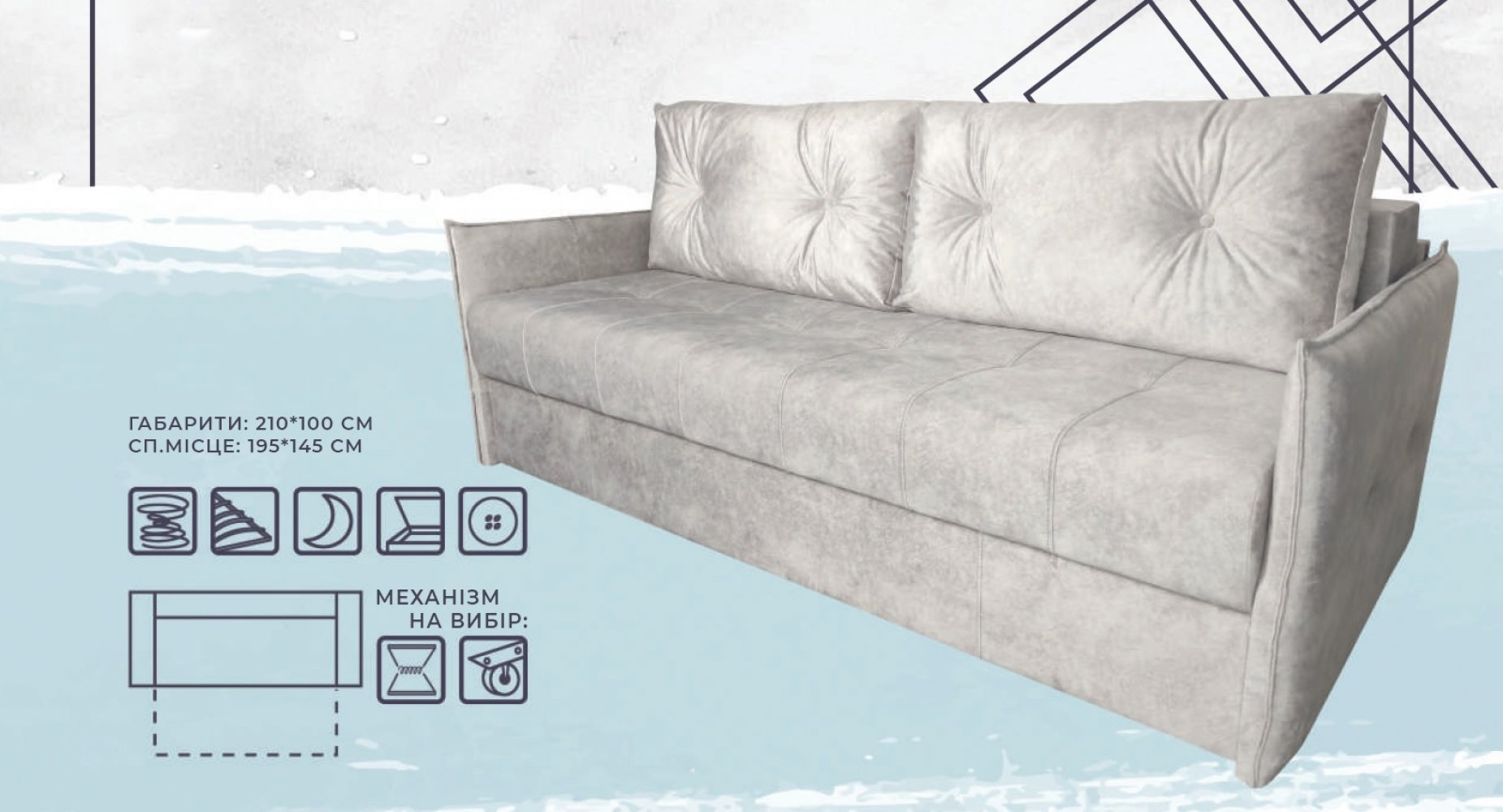 Цей механізм дозволяє швидко й без зайвих зусиль трансформувати диван у комфортне спальне місце. Для розкладання необхідно висунути сидіння вперед, після чого спинка плавно опускається на утворений простір. Завдяки такій конструкції процес трансформації відбувається легко та безшумно, а поверхня для сну залишається рівною та зручною.