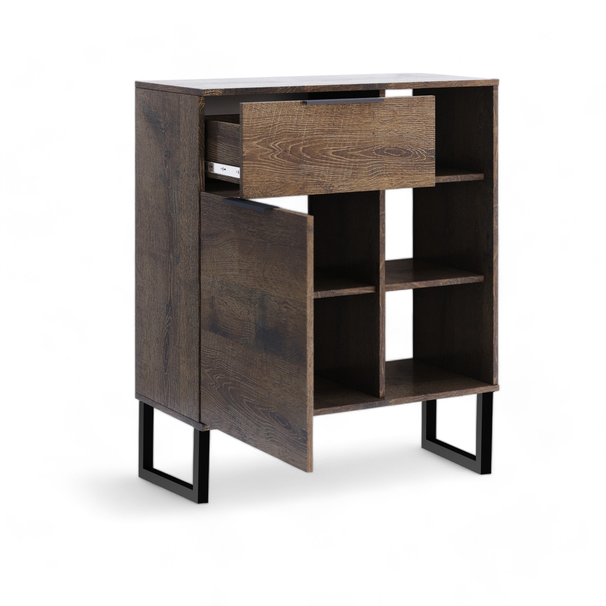 Конструкція виконана з якісної ДСП, що забезпечує стабільність форми та витримує щоденне навантаження у зоні активного користування. Корпус і фасад виготовлені з ламінованої ДСП у кольорі Дуб барокко — глибокий деревний відтінок з виразною текстурою підсилює природність стилю лофт і гармонійно поєднується з чорними металевими деталями. Висувна шухляда оснащена телескопічними направляючими повного висування, що забезпечують плавний і повний доступ до вмісту. Міцні металеві ніжки виконують не лише опорну, а й композиційну функцію — вони продовжують геометрію корпусу та формують характерний каркасний силует. Комплектується інструкцією та повним набором фурнітури для монтажу.