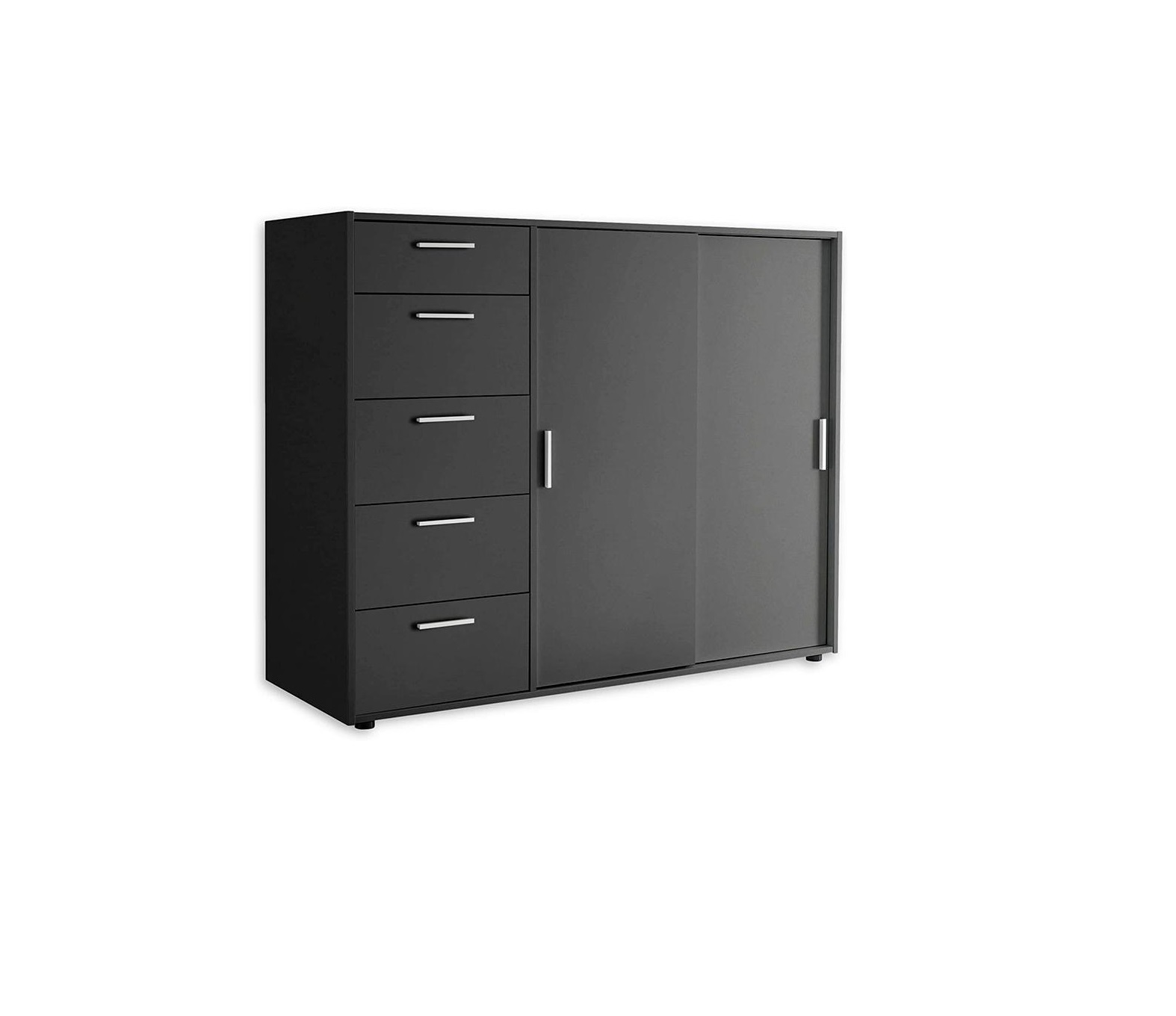 Корпус і фасади виготовлені з якісної ДСП, що забезпечує надійність конструкції та стабільність навіть при активному щоденному використанні. П’ять шухляд оснащені трьохскладовими телескопічними направляючими кулькового типу повного висування підвищеної міцності, що гарантують плавність руху та довговічність механізмів. Дверцята працюють на сучасній розсувній системі, що дозволяє економити простір і додає моделі функціональної оригінальності. Ручки виконані з пластику з хромованим матовим покриттям, яке делікатно контрастує з глибоким відтінком фасадів. У комплект входить додаткова фурнітура для кріплення комода до стіни, що підвищує безпеку експлуатації. Модель представлена у кольорі Графіт сірий — стильному сучасному тоні, який підкреслює дизайнерську концепцію виробу. Комплектується інструкцією та повним набором фурнітури для монтажу.