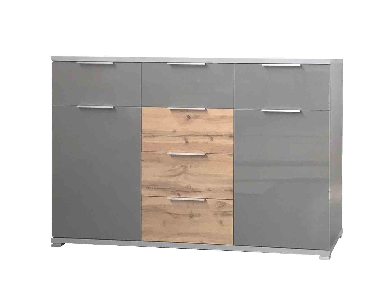 Комод Лінц 2дв 6шх Міромарк у поєднанні відтінків Сірий шифер / Дуб вотан виглядає як продуманий дизайнерський жест у сучасній вітальні. Насичений сірий корпус формує стриману індустріальну основу, а теплий натуральний відтінок Дуб вотан у центральних шухлядах створює виразний контраст і додає композиції глибини. Горизонтальний поділ на три логічні секції робить модель не лише візуально цікавою, а й функціонально зручною. Ліворуч і праворуч — поєднання шухляди та закритого відділення з полицею, у центрі — чотири шухляди для системного зберігання. Це комод, який здатен стати центральною деталлю інтер’єру в стилі модерн або лофт, підкреслюючи характер простору.