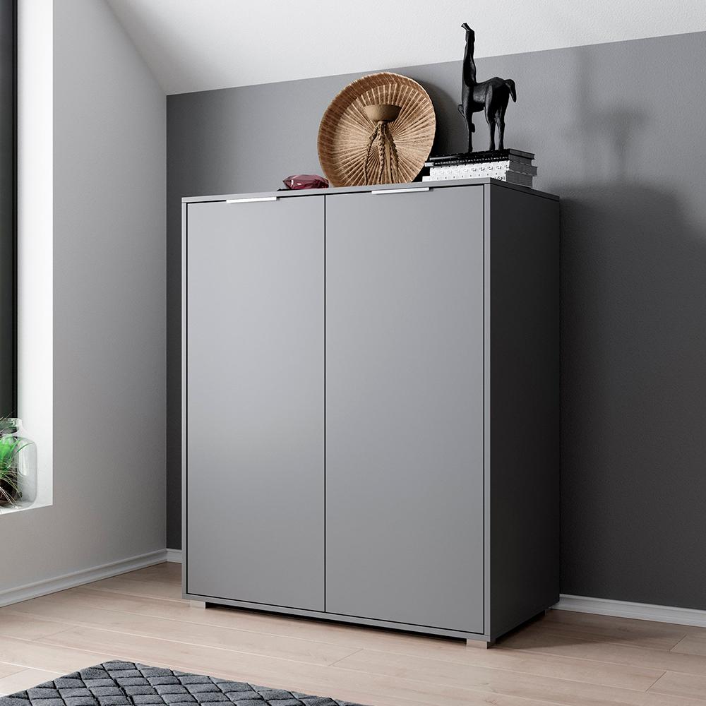 Комод виготовлений із якісної ДСП, що забезпечує міцність конструкції та стабільність при щоденному використанні. Поверхні мають акуратне покриття, яке зберігає насиченість кольору й підтримує сучасний вигляд виробу. Дверцята встановлені на петлях прихованого монтажу, що забезпечують плавне відкривання та підкреслюють чистоту ліній без зайвих виступаючих елементів. Ручки виконані з пластику з хромованим матовим покриттям, що гармонійно поєднується з глибоким відтінком фасадів. Модель представлена у кольорі Графіт сірий — універсальному сучасному тоні, який створює виразний, але стриманий акцент у просторі. Комплектується інструкцією та повним набором фурнітури для монтажу.
