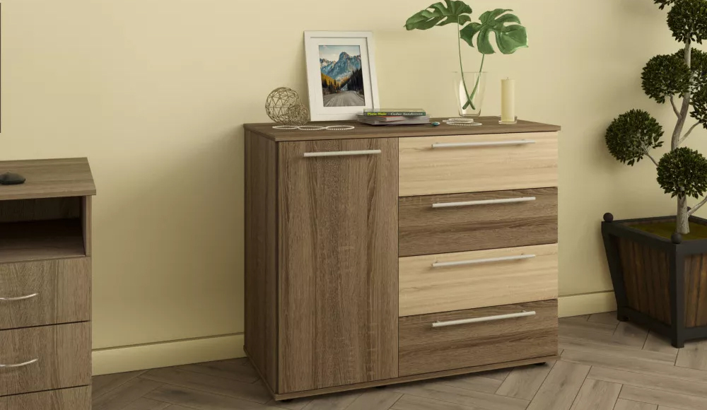 Комод 3 Стандарт MatroLuxe — це практичне рішення для тих, хто шукає зручний баланс між місткістю та акуратним зовнішнім виглядом. Модель поєднує чотири висувні шухляди та закриту секцію з дверцятами, що дозволяє логічно розподілити зберігання речей різного формату — від дрібних аксесуарів до більш габаритних предметів. Лаконічний дизайн без зайвих декоративних елементів робить комод універсальним для житлових просторів, де важлива функціональність і візуальна стриманість. Завдяки продуманій конструкції комод легко інтегрується в сучасні інтер’єри, підтримуючи порядок і не перевантажуючи простір.