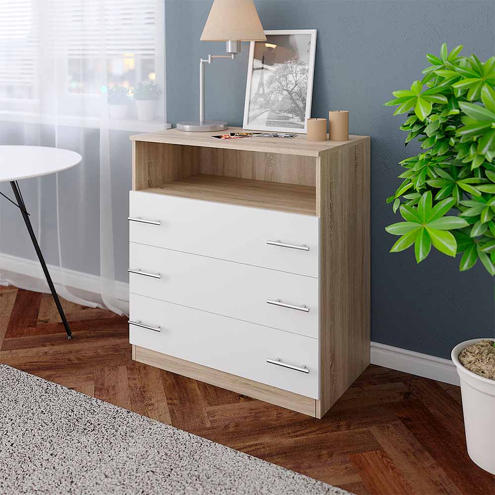 Комод виготовлений із міцної ламінованої ДСП, яка забезпечує довговічність конструкції та простоту у догляді. Три висувні шухляди оснащені телескопічними напрямними для плавного, легкого й безшумного ходу. Відкрита ніша додає зручності та дозволяє розмістити речі, які мають бути завжди під рукою. Металеві ручки роблять користування комодом комфортним і підкреслюють сучасний характер моделі. Виріб постачається у розібраному вигляді з комплектом фурнітури та інструкцією для складання.