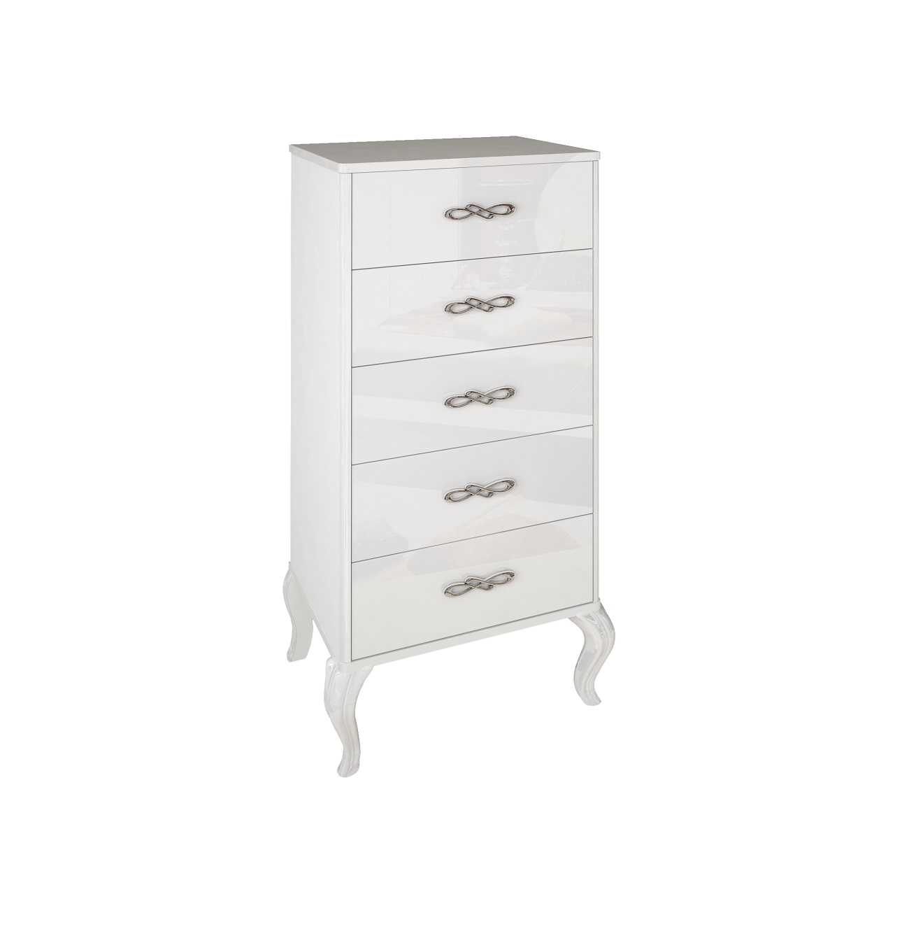 Корпус виготовлений із надійної ДСП у кольорі Білий глянець, що забезпечує стійкість конструкції та довговічність у щоденному користуванні. Фасади з ДСП мають багатошарове лакове покриття, висушене під ультрафіолетовими променями, завдяки чому поверхня зберігає насичений блиск і не змінює відтінок з часом. П’ять шухляд оснащені міцними телескопічними направляючими повного висування підвищеної надійності, що гарантують плавний і комфортний рух. Високі ніжки виконані з поліуретану, додаючи конструкції легкості та зручності під час прибирання, а фігурні ручки з металу з хромованим покриттям підкреслюють декоративність стилю прованс. Модель продумана для стабільності навіть при повному навантаженні. Комплектується інструкцією та повним набором фурнітури для монтажу.