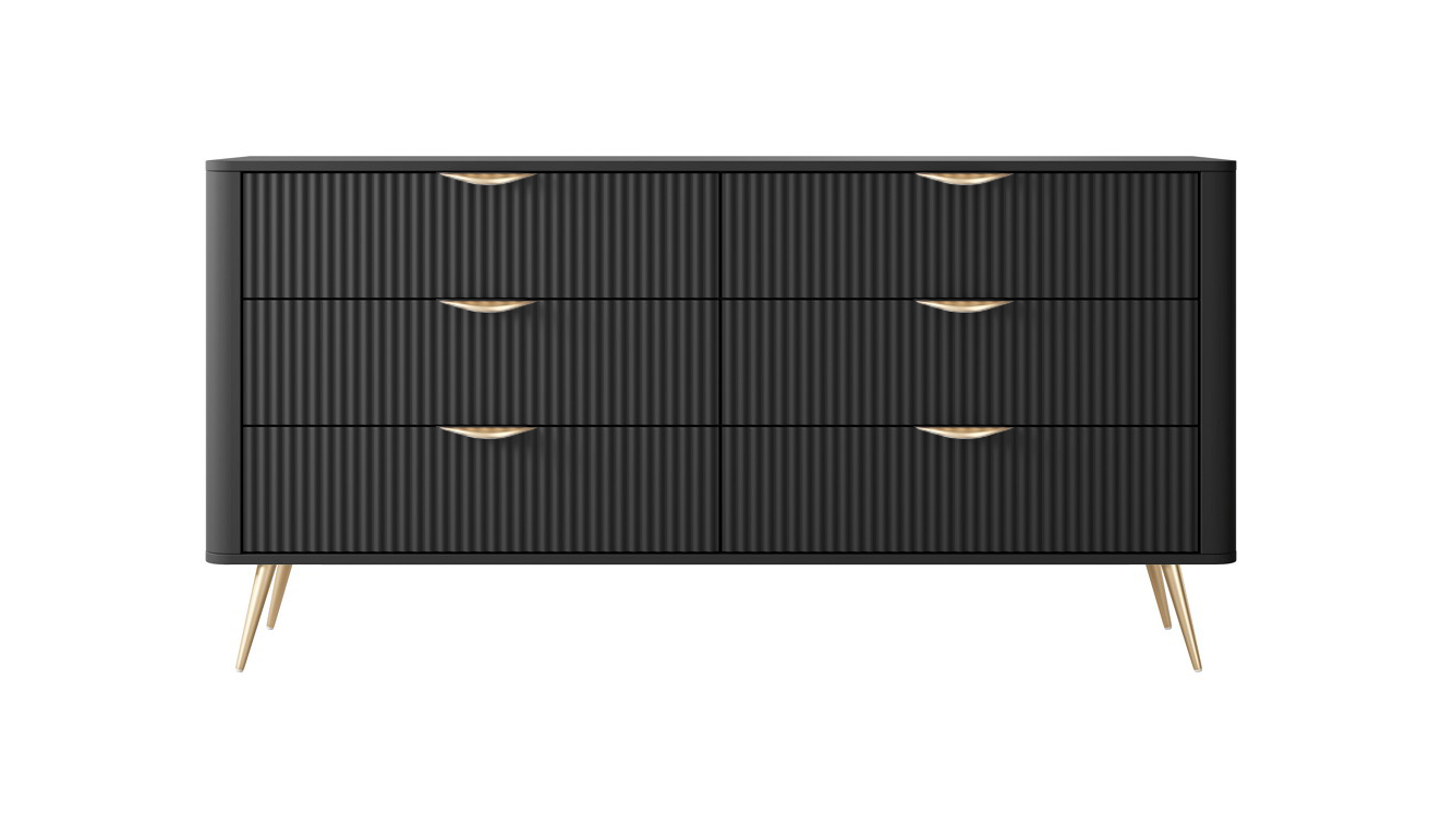 Комод Ланте / Lante 6S/163 — це елегантний та місткий меблевий елемент, який відмінно поєднується з інтер’єрами у стилі модерн, мінімалізм або лофт. Глибокий чорний колір корпусу та фасадів надає виробу виразності й витонченості, створюючи актуальний естетичний акцент у будь-якій кімнаті. Продуманий дизайн відрізняється не лише стриманою кольоровою палітрою, а й гармонійними пропорціями, чіткими лініями та сучасними деталями, які роблять комод помітним та стильним предметом інтер’єру. Корпус виготовлений із міцної ламінованої ДСП високої якості з ABS-кромкою, що посилює захист від подряпин, відшаровування та впливу вологи. Така кромка не лише подовжує термін служби меблів, а й надає виробу більш завершеного вигляду. Фасади виконані з МДФ, що забезпечує рівну поверхню без дефектів та приємну текстуру. Цей матеріал не лише підвищує довговічність, а й надає комоду преміального вигляду. Комод оснащений шістьма місткими висувними шухлядами, які дозволяють зручно організувати зберігання одягу, білизни, аксесуарів чи документів. Шухляди працюють плавно та безшумно завдяки телескопічним направляючим, що гарантують комфортне відкривання та легкий доступ до вмісту. Особливий акцент у дизайні створюють золоті металеві ніжки, які додають конструкції легкості, стійкості та полегшують прибирання під меблями. Завершують стильний вигляд золоті металеві ручки, що гармонійно підкреслюють сучасний характер моделі.