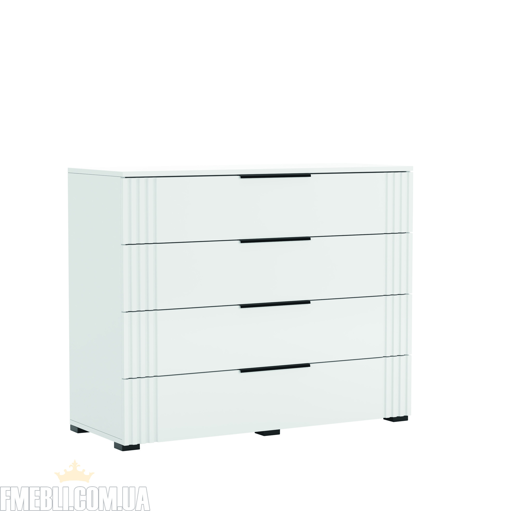 Комод виготовлений із ламінованої ДСП та МДФ фасадів із глянцевим покриттям, що забезпечує міцність конструкції та довговічність у використанні. Білий глянець створює дзеркальний ефект, підсилюючи освітлення в приміщенні та додаючи інтер’єру сучасного вигляду. Модель оснащена чотирма висувними шухлядами, які дозволяють зручно розміщувати речі та підтримувати порядок. Шухляди працюють стабільно у щоденному використанні та забезпечують легкий доступ до вмісту завдяки телескопічним направляючим. Металеві ручки мають акуратний вигляд і підкреслюють стиль моделі, а пластикові ніжки забезпечують стійкість конструкції. Комплектується інструкцією та повним набором фурнітури для монтажу.