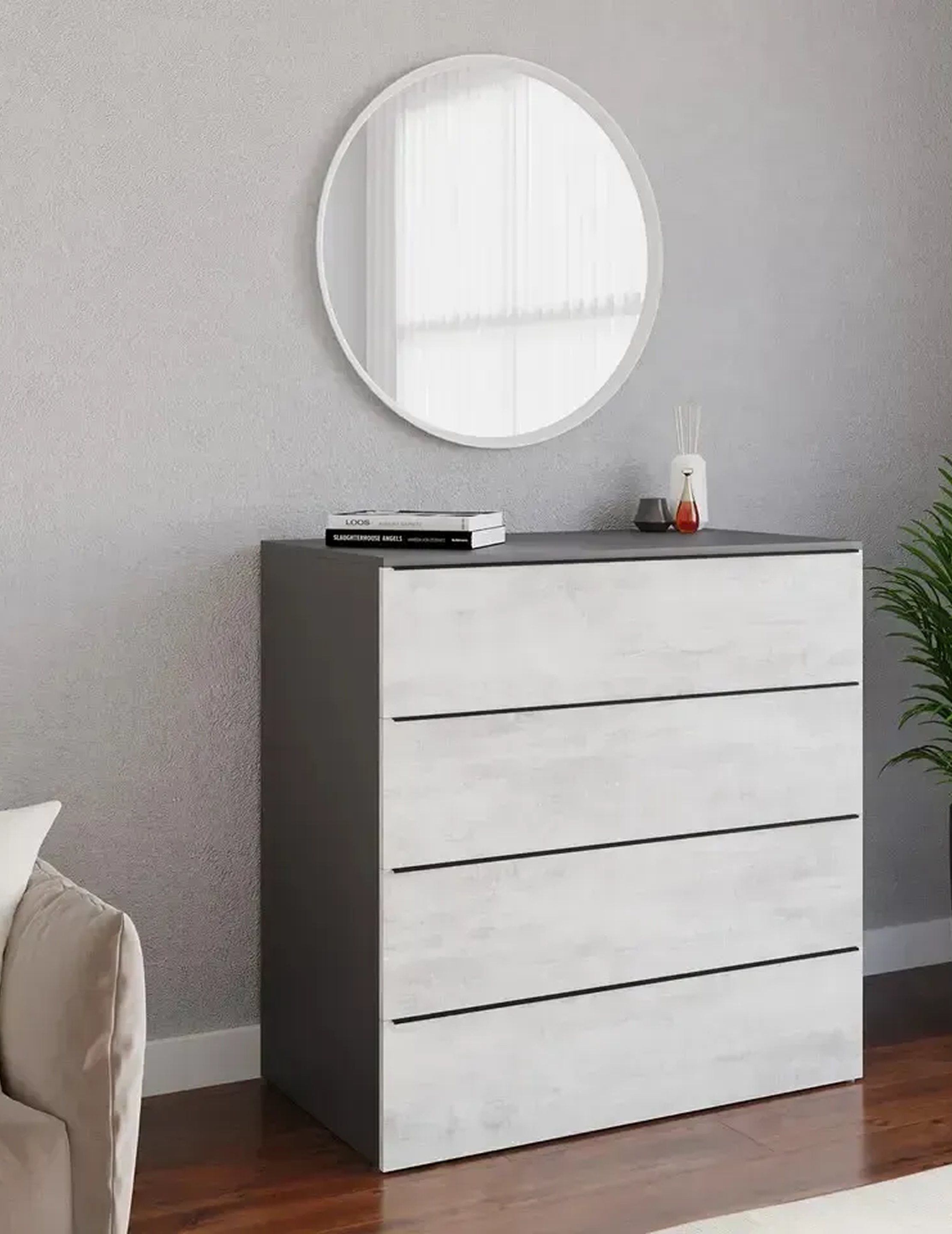 Комод виготовлений з ламінованої ДСП для корпусу та фасадів, що забезпечує зносостійкість, стабільність конструкції та простоту у догляді. Модель виконана в комбінації кольорів Антрацит (корпус) і Бетон (фасад), що створює сучасний індустріальний характер виробу. Висувні елементи оснащені телескопічними направляючими, які забезпечують плавний і контрольований хід шухляд. Відсутність зовнішніх ручок підтримує чистоту фасадів і підсилює hi-tech стилістику. Комплектується інструкцією та повним набором фурнітури для монтажу.