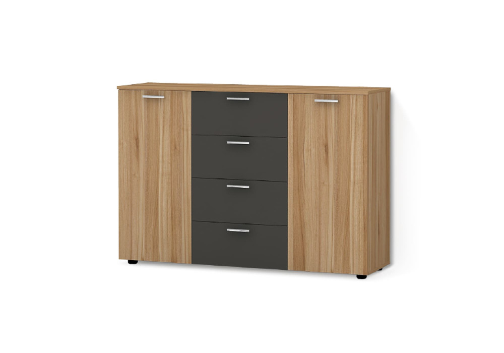 Комод виготовлений з ламінованої ДСП, що забезпечує стабільність конструкції та комфорт у щоденному користуванні. Модель складається з трьох секцій: дві бокові секції з дверцятами та полицями всередині й центральна секція з висувними шухлядами, що дозволяє поєднати закрите та швидкодоступне зберігання. Комод пропонується в декількох поєднаннях кольорів, серед яких Сіра глина, Морське дерево карбон, Кашемір, Дуб сонома світлий, Дуб кремона канноло, Дуб крафт золотий, Дуб крафт білий, Дуб експресив бронзовий, Дуб бароко рістретто, Дуб бароко бурштиновий, Біле дерево, Біла аляска, Антрацит. Висувні шухляди оснащені телескопічними направляючими, які забезпечують плавний і контрольований хід. Алюмінієві ручки додають моделі стриманої виразності, а регульовані опори дозволяють адаптувати комод до поверхні підлоги. Комплектується інструкцією та повним набором фурнітури для монтажу.