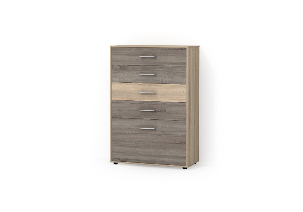 Комод виготовлений з ламінованої ДСП товщиною 16 мм, яка забезпечує стабільність конструкції та комфорт у щоденному користуванні. Модель випускається у готових кольорових рішеннях, що поєднують натуральні деревні відтінки: корпус Орех ліон світлий з фасадом Біла аляска або корпус та вставка Дуб сонома світлий з фасадом Дуб сонома трюфель. Висувні елементи оснащені телескопічними направляючими, які забезпечують плавний і контрольований хід шухляд. Подовжені меблеві ручки з металу з алюмінієвим покриттям підкреслюють мінімалістичний характер дизайну та зручні у повсякденному використанні. Регульовані опори дозволяють адаптувати комод до поверхні підлоги. Комплектується інструкцією та повним набором фурнітури для монтажу.