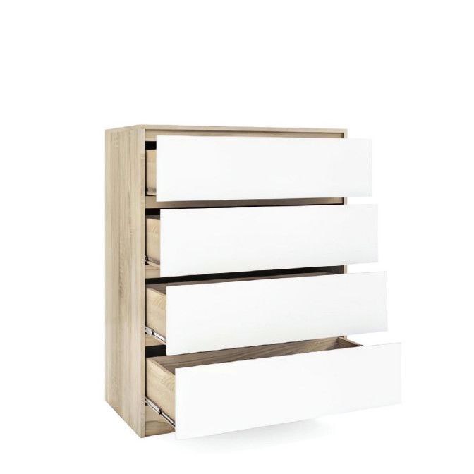 Комод Іда — це вдале поєднання сучасного стилю, практичності та витонченого дизайну, яке стане гармонійним доповненням будь-якого інтер’єру. Його елегантне поєднання кольорів Дуб Аппалачі / Німфея Альба створює відчуття тепла натурального дерева та легкості білого відтінку, завдяки чому меблі виглядають сучасно й затишно. Корпус та фасади виготовлені з якісної ламінованої ДСП, що забезпечує стійкість до подряпин, зносу, простоту у догляді та привабливий зовнішній вигляд на довгі роки. Комод оснащений чотирма місткими висувними шухлядами, у яких зручно зберігати одяг, білизну, аксесуари чи домашні дрібниці, підтримуючи порядок у кімнаті. Плавне та комфортне користування забезпечують телескопічні напрямні, які дозволяють шухлядам висуватися легко й безшумно навіть при щоденному використанні. Окремої уваги заслуговує сучасна система відкривання push to open, яка дозволяє відкривати шухляди легким натисканням, підкреслюючи мінімалістичний характер моделі та забезпечуючи максимальний комфорт у користуванні.