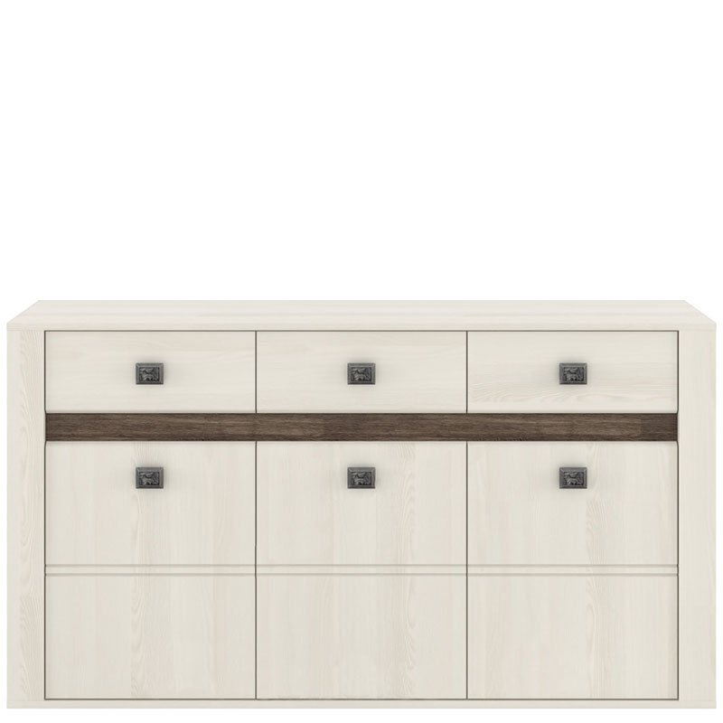 Комод виготовлений із ламінованої ДСП, що забезпечує міцність конструкції та стійкість до щоденного навантаження. Посилена верхня панель товщиною 22 мм додає стабільності та дозволяє використовувати поверхню для розміщення декору або побутових предметів. Поєднання кольорів ясен сніжний та дуб ансберг темний підкреслює текстуру матеріалу та створює сучасний вигляд. Конструкція включає три висувні шухляди та три відділення з полицями, що дозволяє зручно організувати зберігання різних речей. Шухляди оснащені направляючими HAFELE повного висування, які забезпечують плавний рух і комфорт у користуванні, а дверцята встановлені на петлях FGV для надійної роботи. Металеві ручки SIRO мають стриманий декоративний вигляд, зручні у використанні та гармонійно доповнюють дизайн моделі. Пластикові ніжки забезпечують стійкість конструкції та захищають підлогу від пошкоджень. Комплектується інструкцією та повним набором фурнітури для монтажу.