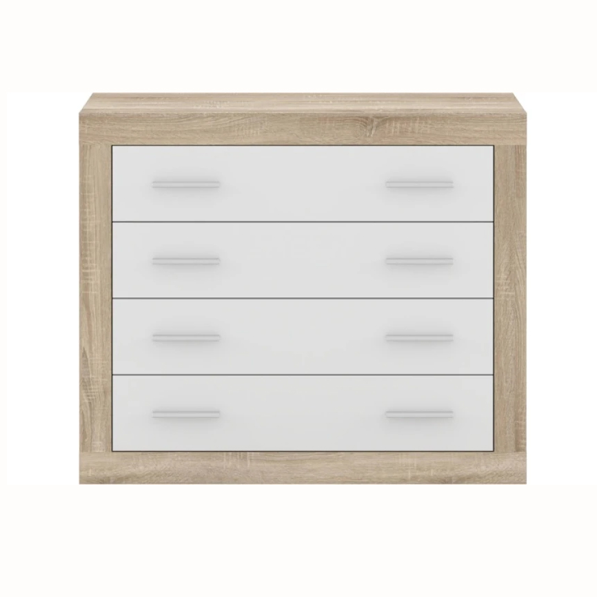 Комод виготовлений з ламінованої ДСП, що забезпечує міцність конструкції та стійкість до щоденного використання. Поєднання кольорів Дуб сонома/Німфея альба створює гармонійний контраст і додає інтер’єру світла та тепла одночасно. Поверхні легко очищуються та добре витримують щоденні навантаження. Конструкція передбачає чотири містких шухляди, які дозволяють зручно організувати зберігання одягу, білизни або інших речей. Шухляди оснащені роликовими направляючими, що забезпечують плавний рух і комфорт у користуванні. Ручки з міцного пластику і мають зручну форму, що полегшує відкривання та підкреслює сучасний вигляд моделі. Комплектується інструкцією та повним набором фурнітури для монтажу.