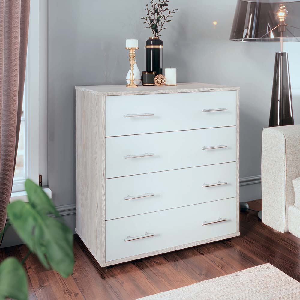 Комод КС виготовлений із міцної ламінованої ДСП, яка забезпечує довговічність конструкції та збереження привабливого вигляду навіть при активній експлуатації. Чотири висувні шухляди оснащені телескопічними напрямними, що забезпечують плавний хід та зручний доступ до вмісту. Металеві ручки роблять користування комфортним і практичним, а корпусна основа гарантує стійкість виробу. Комод постачається у розібраному вигляді з комплектом фурнітури та інструкцією для складання.