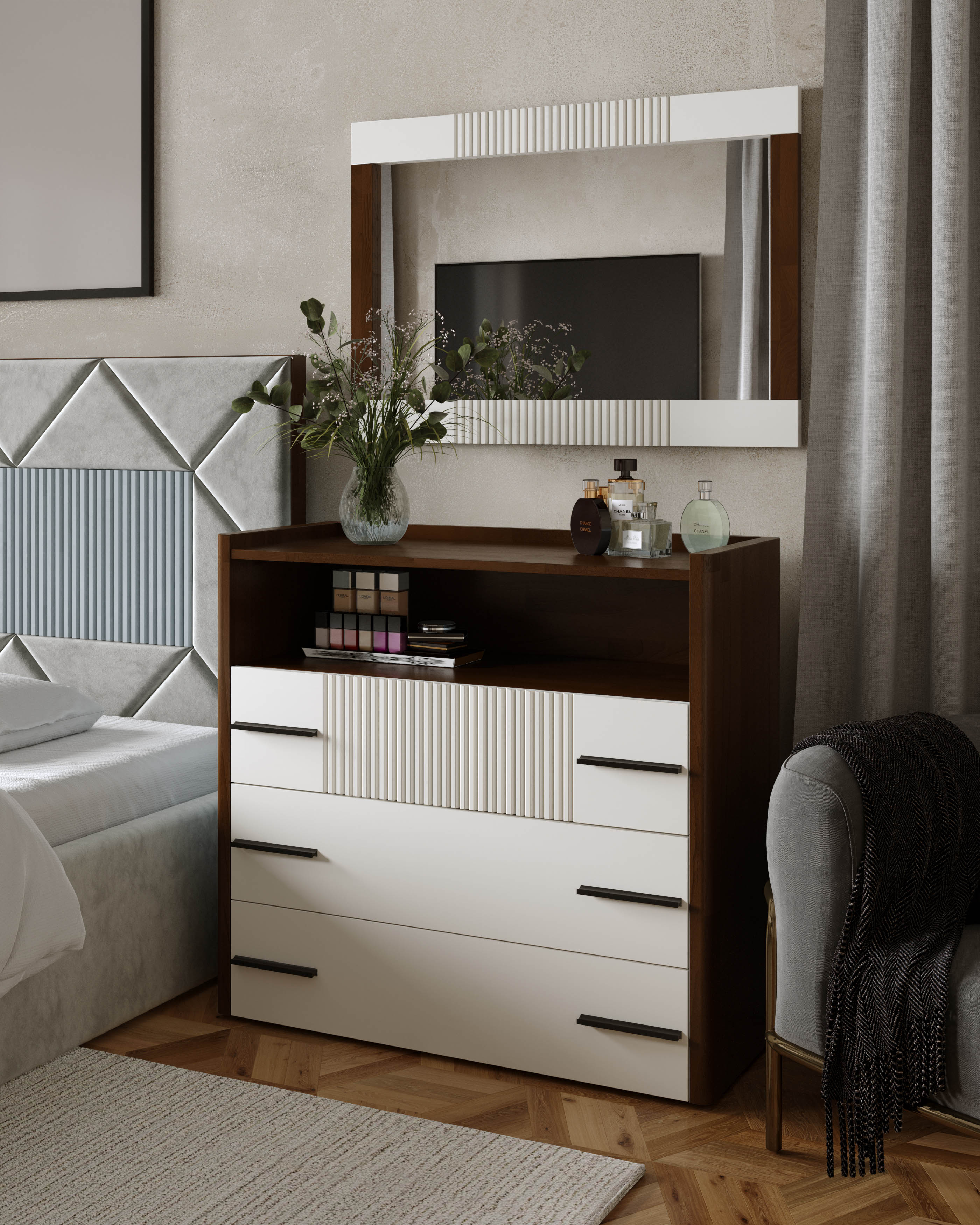 Комод Модерн – стильний та функціональний комод, створений для сучасного інтер’єру – місткі шухляди та продумані відсіки забезпечують зручне зберігання одягу, постільної білизни та аксесуарів – лаконічний дизайн із чіткими лініями робить модель універсальною та легко вписується в будь-який стиль – міцна конструкція та якісні матеріали гарантують довговічність і надійність – комод стане ефектним акцентом у спальні, вітальні чи передпокої, поєднуючи практичність і сучасну естетику.