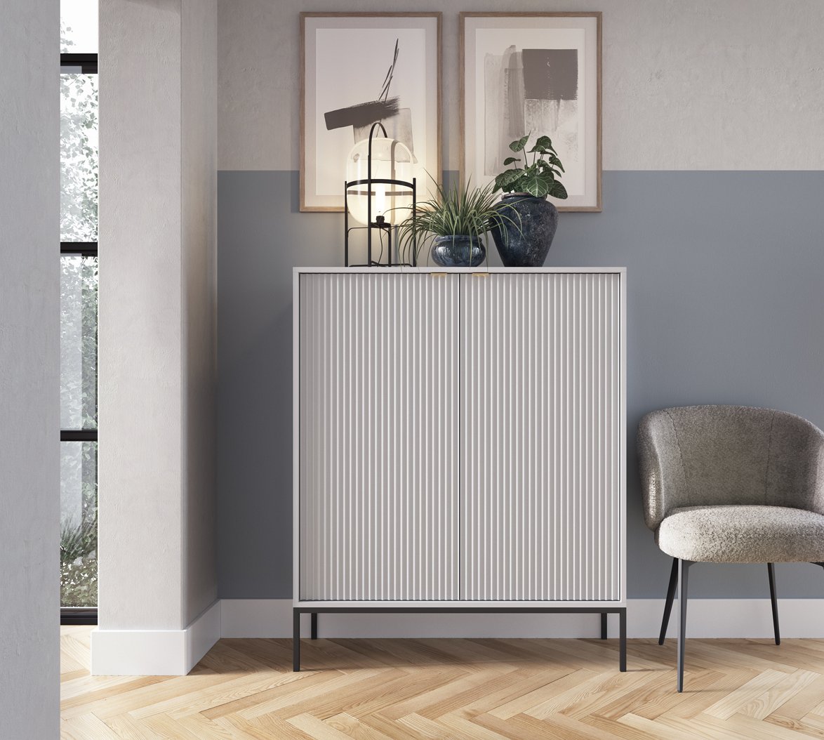 Елегантний сучасний стиль. Сірий колір — це універсальний, стриманий відтінок, який поєднує сучасність і елегантність, створюючи атмосферу спокою та гармонії. У поєднанні з золотими металевими ручками він додає комоду стильного характеру, роблячи його виразним елементом інтер’єру.