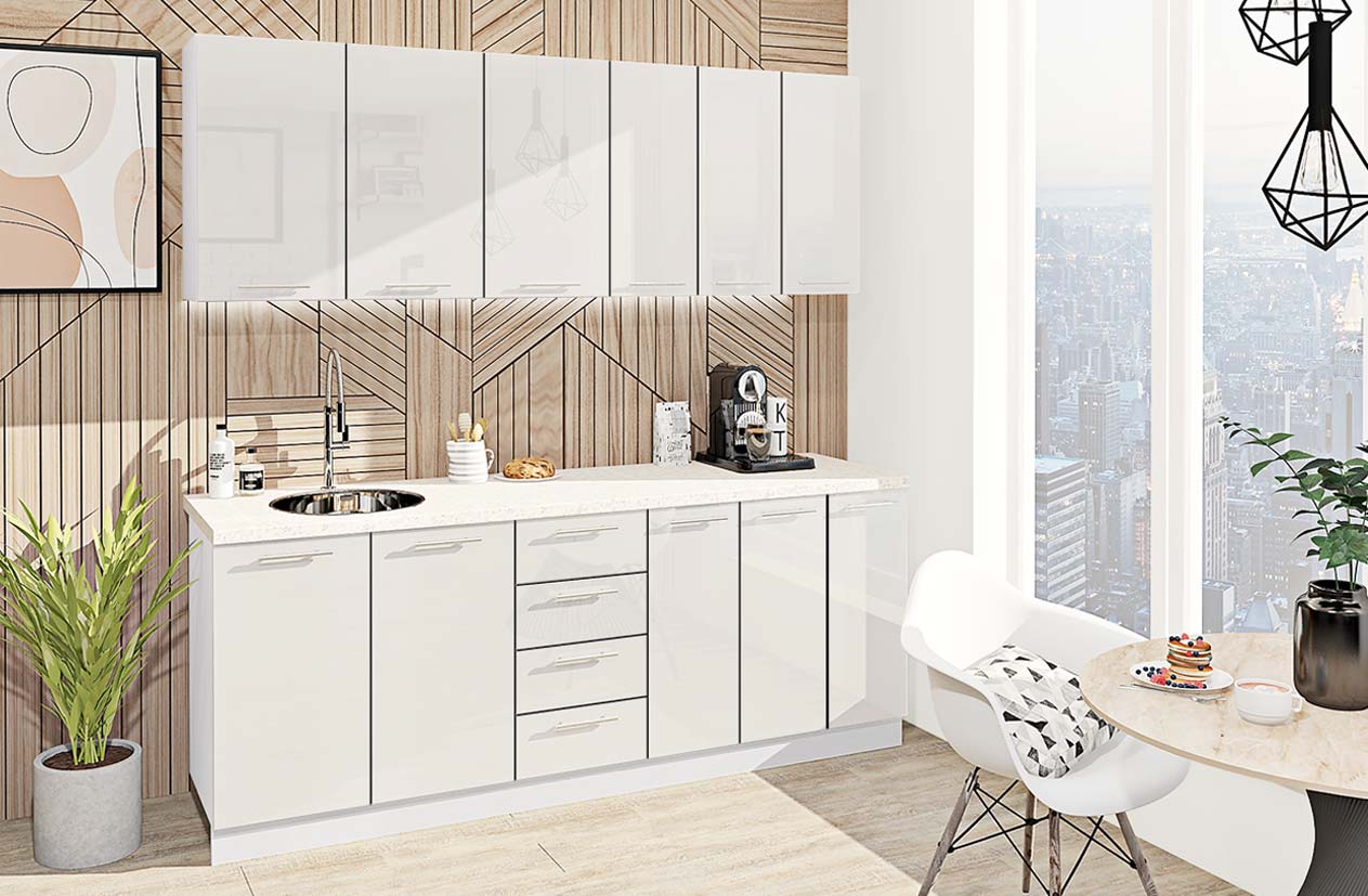 Кухонний комплект Фарбований високий глянець 2,1 м – це сучасне та елегантне рішення для тих, хто цінує стиль, комфорт і функціональність у компактному просторі. Завдяки продуманій модульній системі можна легко підібрати оптимальне поєднання елементів під будь-яке планування – від невеликої квартири до зручної кухонної зони у студії.Ергономічні розміри тумб і стільниць забезпечують комфорт у приготуванні, а фасади з ручками та високим глянцем надають комплекту сучасного блиску, практичності та витонченості. Різноманіття матеріалів і відтінків робить Фарбований високий глянець 2,1 м універсальним вибором для інтер’єру в різних стилях.Широкий вибір модулів дозволяє створити індивідуальний набір, який поєднує функціональність, естетику та раціональне використання простору. Мінімалістична за формою, але багата на деталі, ця кухня стане стильним акцентом вашого дому, наповнюючи його комфортом і сучасною елегантністю.