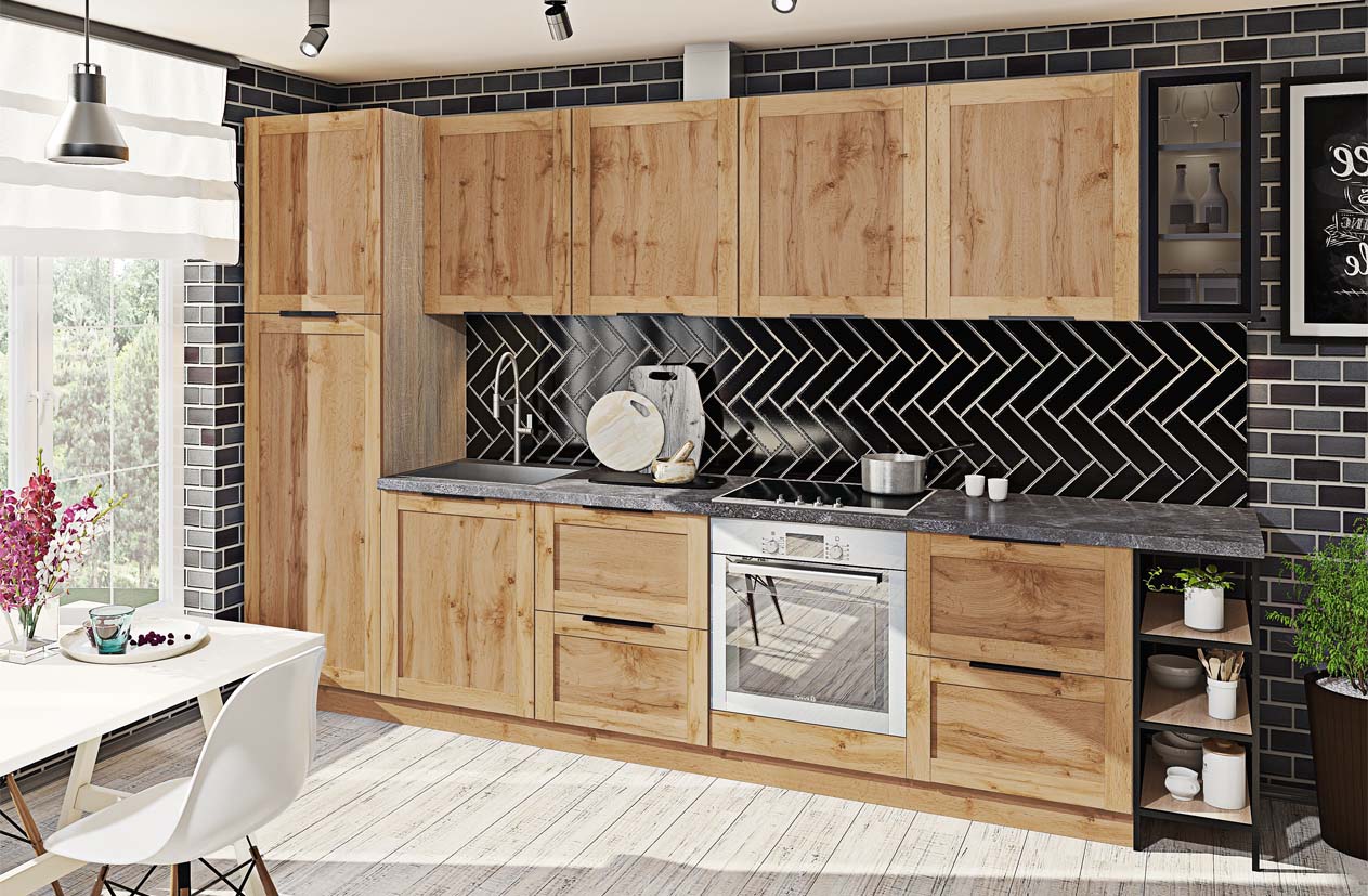 - Цокольний плінтус. Нижні секції обладнані плінтусом із ДСП у тон корпусу. За потреби ви можете замовити суцільний плінтус із ДСП або МДФ довжиною кухні.