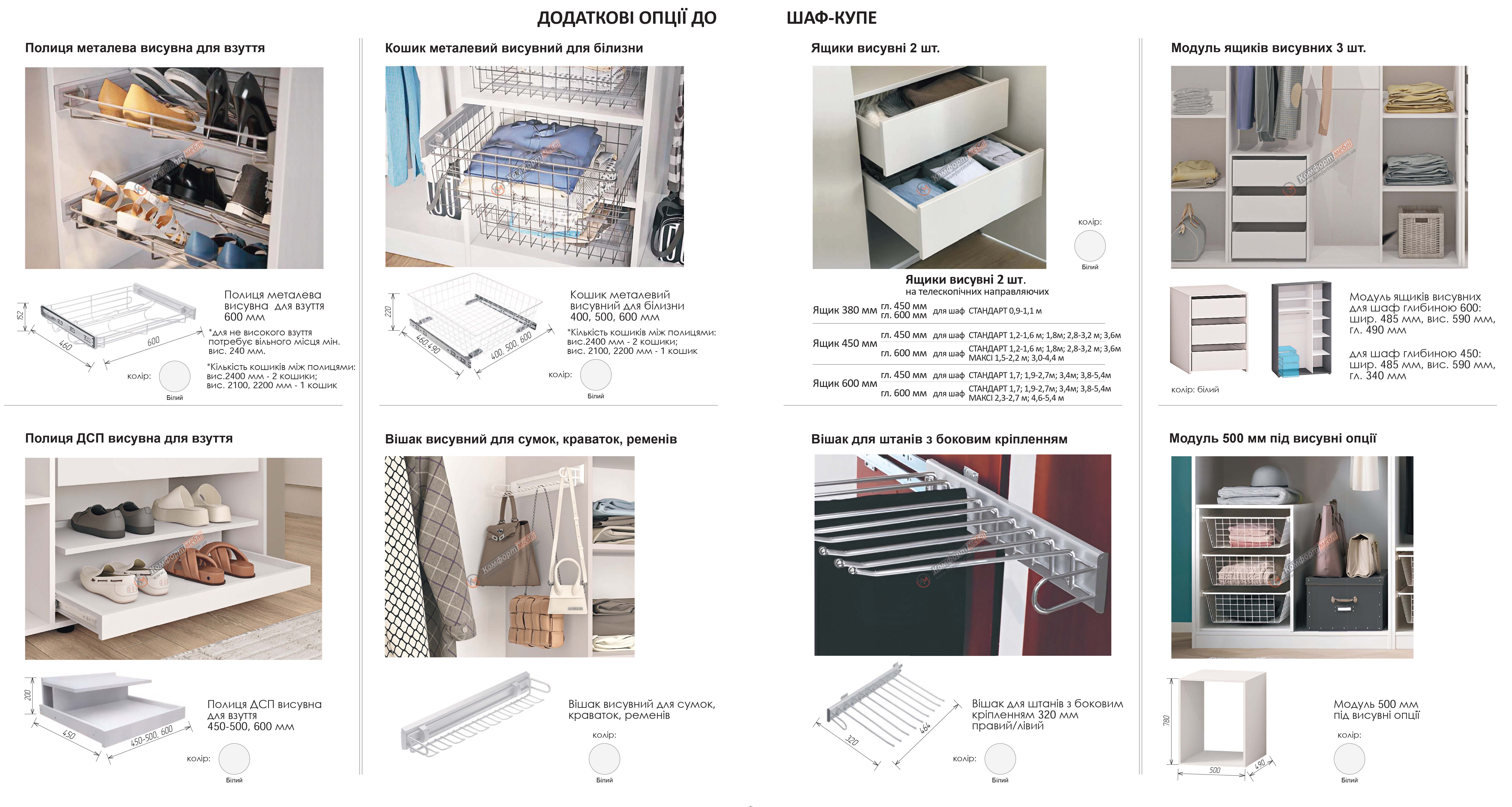 - Базова комплектація - регульовані ніжки, пилозахисна щітка, стопор дверний, штанга труба - для глибини 60 см, штанга висувна - для глибини 45 см.