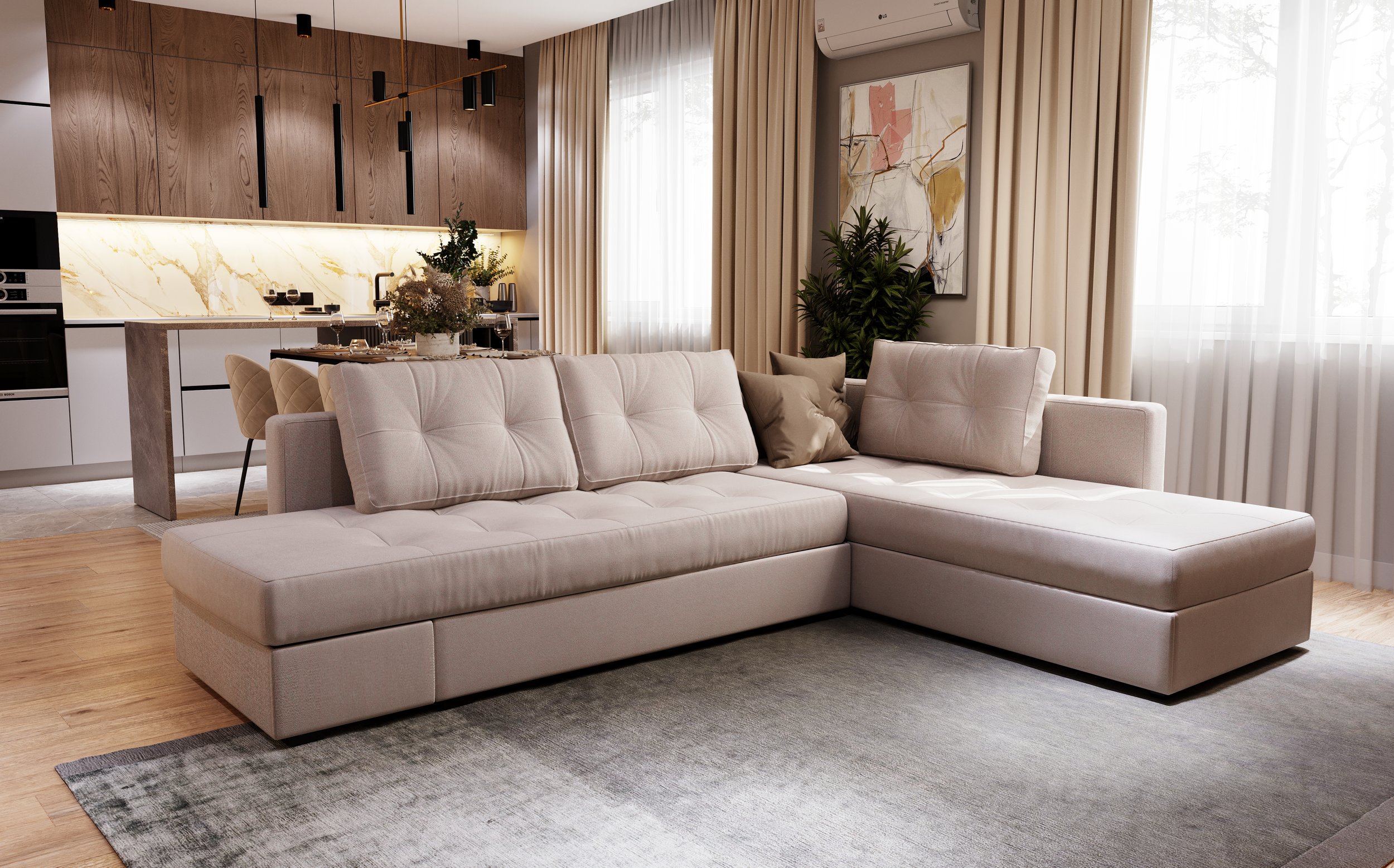 Кутовий диван Стамбул — це меблі, що поєднують у собі елегантний зовнішній вигляд, зручність і функціональність. Його форма ідеально заповнює кут кімнати, створюючи комфортний простір для всієї родини. Широкі сидіння, м’які спинки та якісні матеріали оздоблення роблять цей диван справжнім місцем для відпочинку і затишних вечорів. Дизайн дивану натхненний східною атмосферою: округлі форми, продумана ергономіка та приємна текстура тканини створюють відчуття розкоші й спокою. Надійний механізм трансформації дозволяє швидко перетворити диван у зручне спальне місце, а додаткові подушки додають ще більше комфорту. Стамбул — це не просто диван, а стильний акцент у вашому домі.