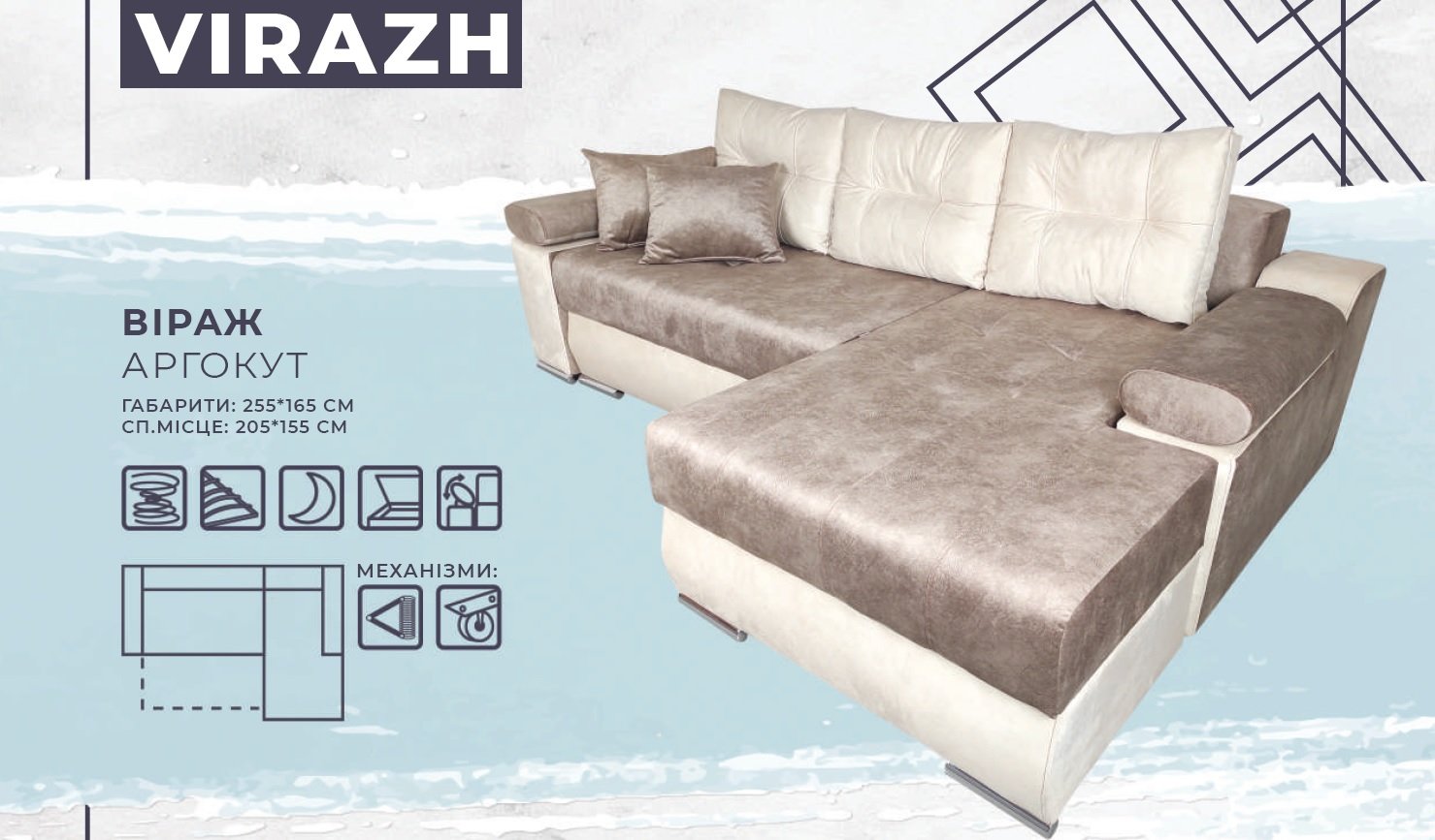 Кутовий диван Віраж — це виразна комбінація динамічного дизайну та домашнього комфорту. Його характерна форма з м’якими вигинами та плавними лініями створює відчуття руху, додаючи інтер’єру особливого шарму та стилю.Завдяки просторому кутовому компонуванню, диван Віраж ідеально підходить для великих сімей або компаній — він легко стає центральним елементом вітальні. Наповнювачі з оптимальною пружністю дарують комфорт під час відпочинку, а глибокі сидіння й м’які спинки підтримують зручне положення тіла.Функція розкладання перетворює диван на повноцінне спальне місце, а прихований короб для зберігання додає практичності. Віраж — це вибір тих, хто цінує не лише функціональність, а й емоції, які дарують стильні та зручні меблі.