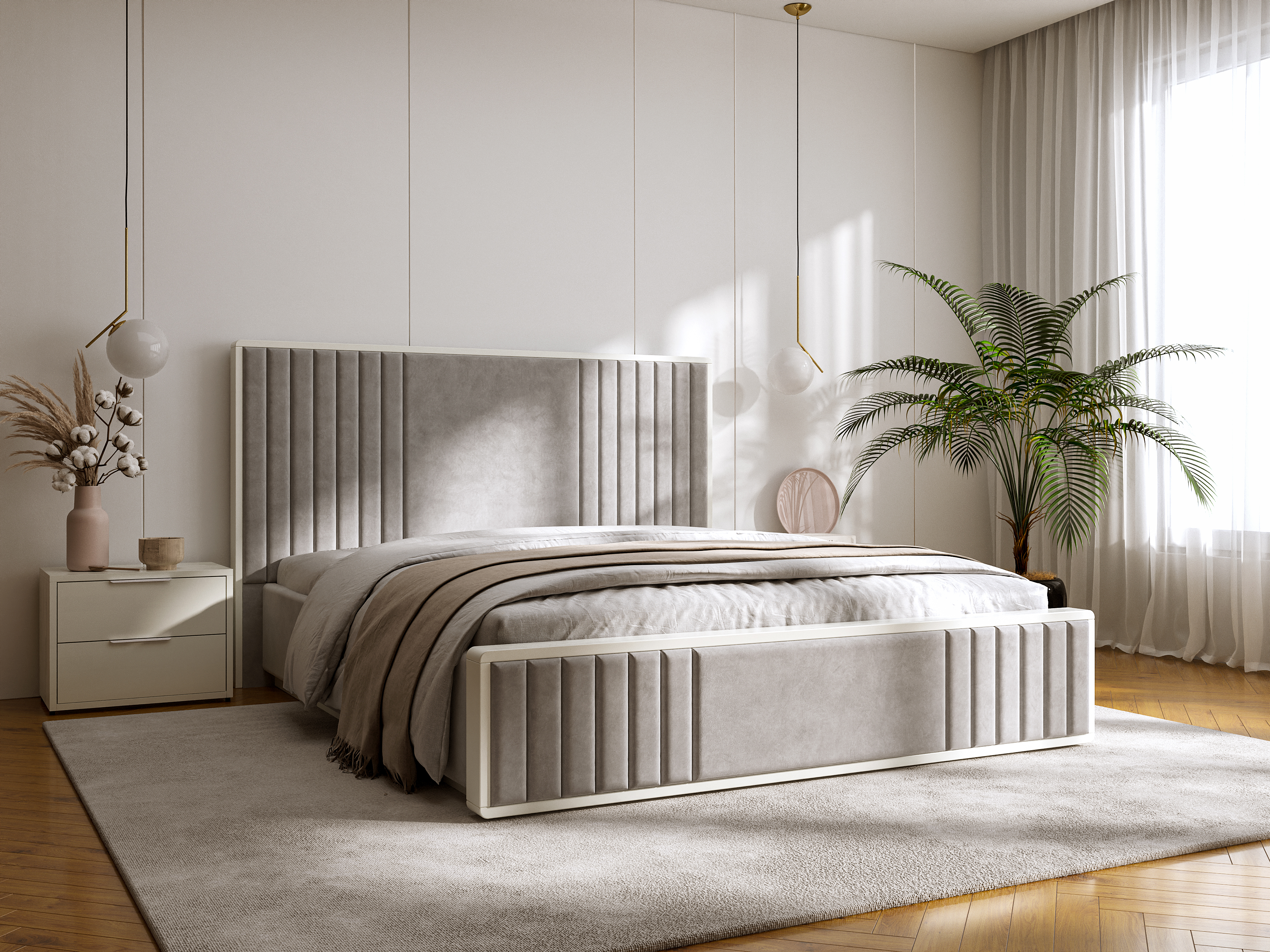 Для просторих кімнат чудово підійдуть моделі з масивним узголів’ям або декоративними елементами — вони стануть акцентом інтер'єру.