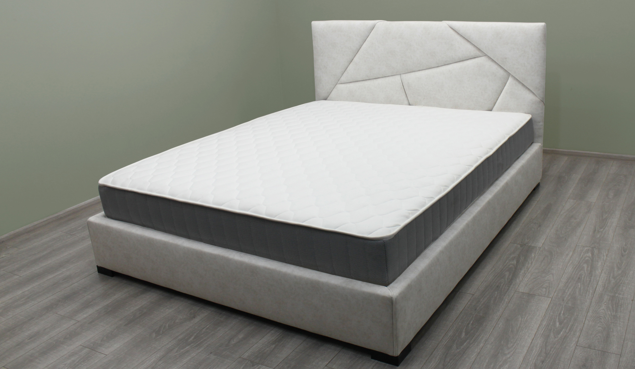 - Узголів’я. Асиметричне дизайнерське узголів’я вирізняється сучасною формою та м’яким оздобленням із тканин, що приємні на дотик і мають підвищену зносостійкість. У його основі — березова фанера, ДВП, синтепон, фібертекс і декоративна планка з ясеня.