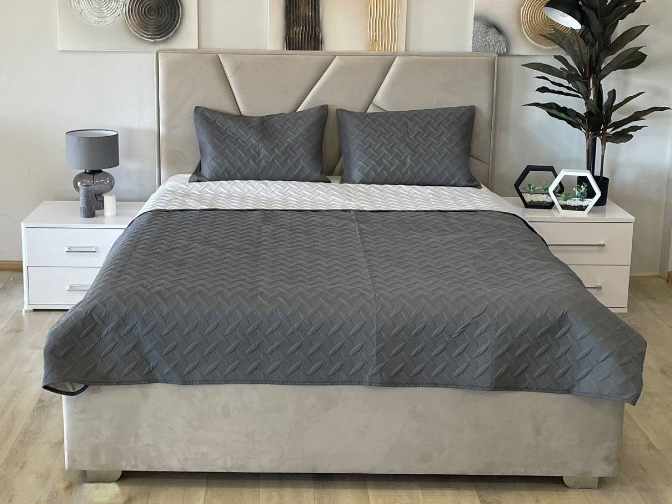Ліжко доступне як у текстильній, так і в оббивці з екошкіри – тож ви можете обрати фактуру й колір, які ідеально доповнять вашу спальню.
