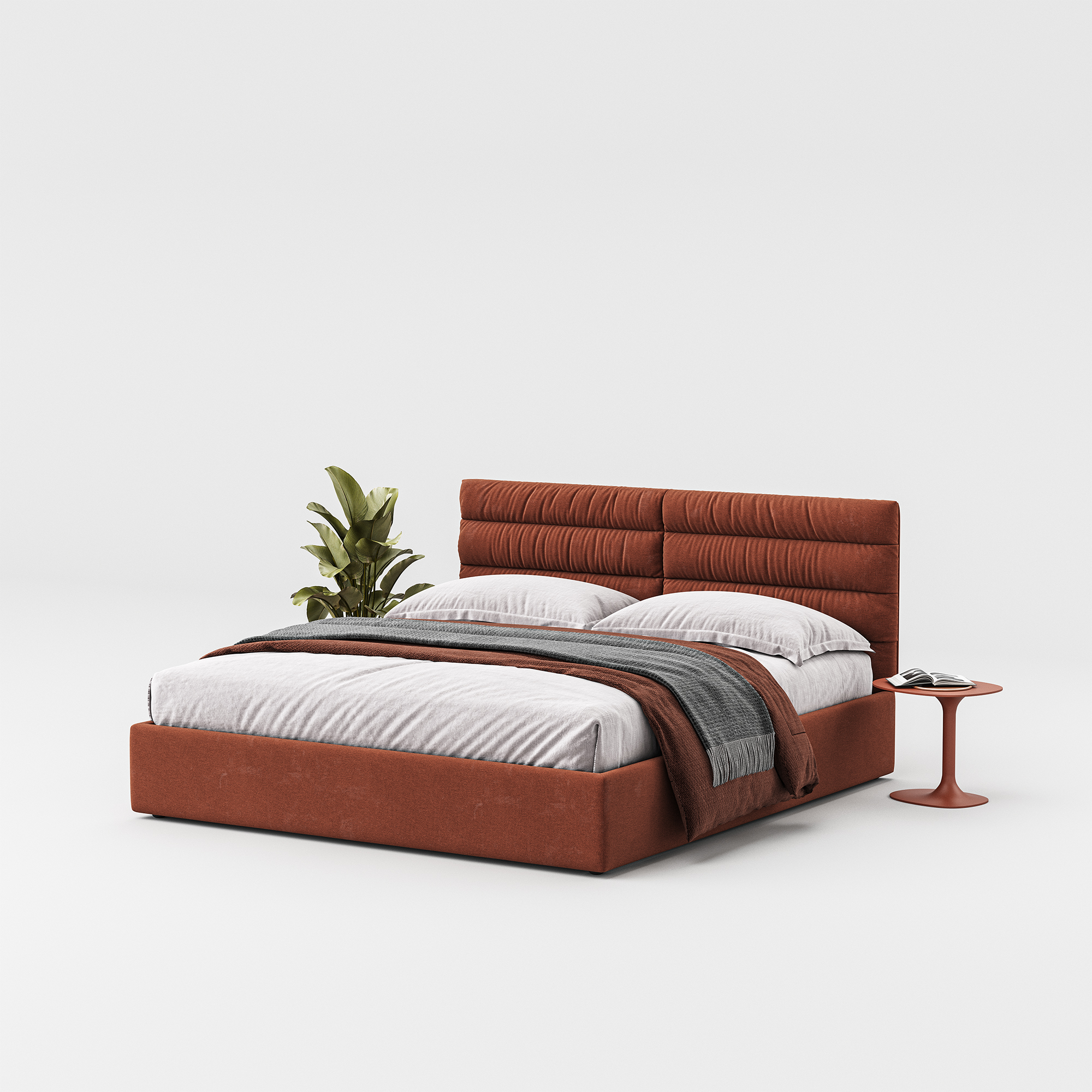 Столик, що кріпиться на бокову царгу ліжка, слугує зручною альтернативою традиційній тумбі. Це додаткове місце для телефону, книги, або нічника, яке за потреби можливо зняти, воно ідеально доповнює ліжко, зберігаючи стильний і лаконічний вигляд інтер'єру.
