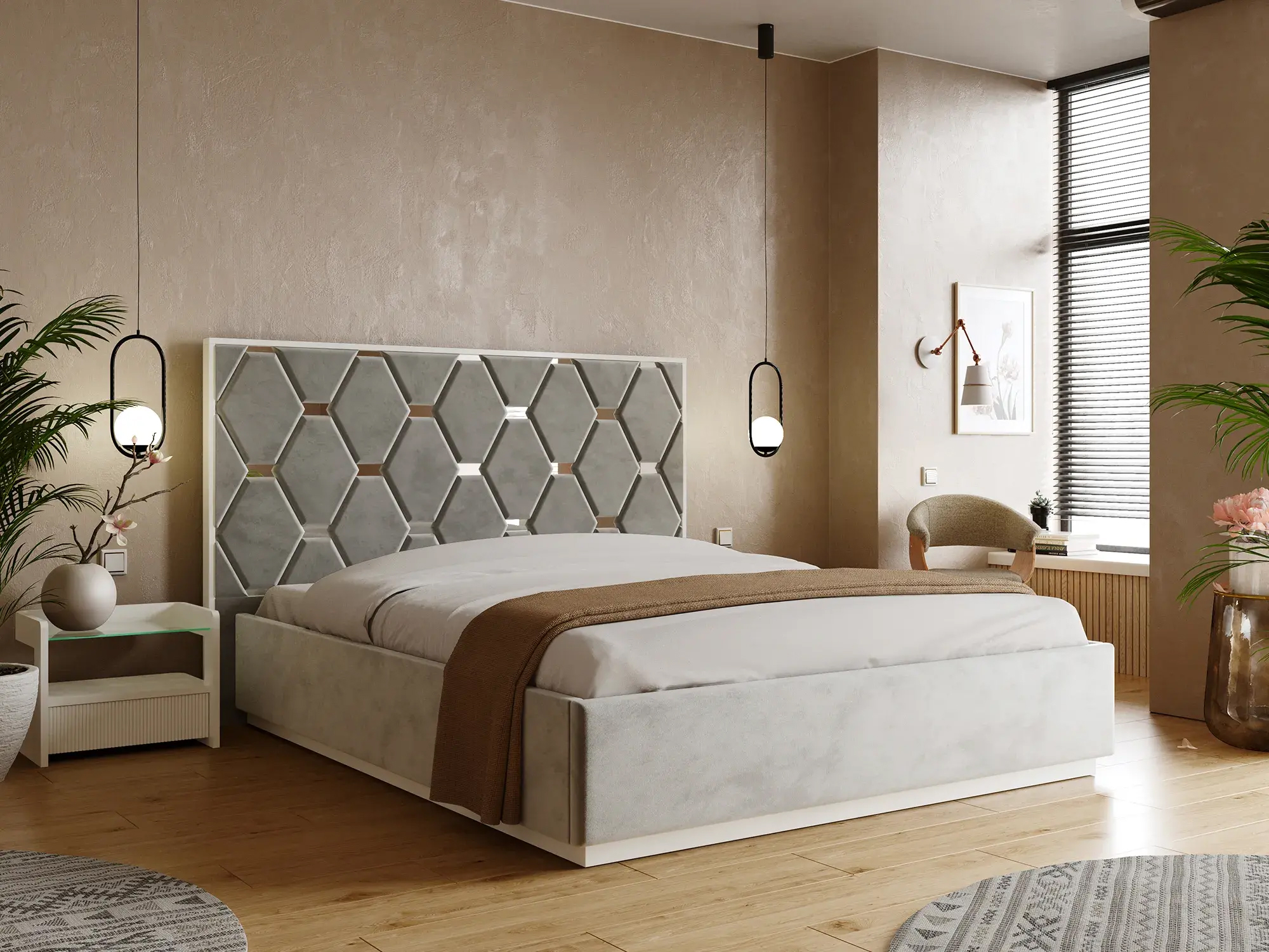 Для просторих кімнат чудово підійдуть моделі з масивним узголів’ям або декоративними елементами — вони стануть акцентом інтер'єру.