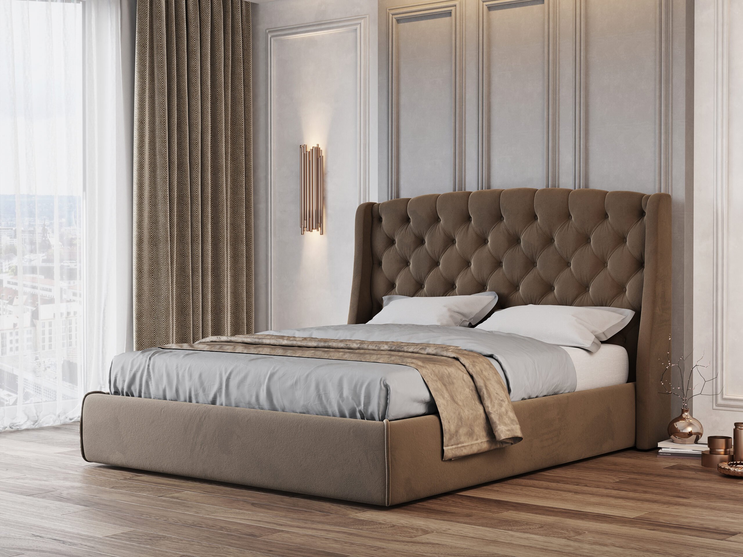 Для просторих кімнат чудово підійдуть моделі з масивним узголів’ям або декоративними елементами — вони стануть акцентом інтер'єру.