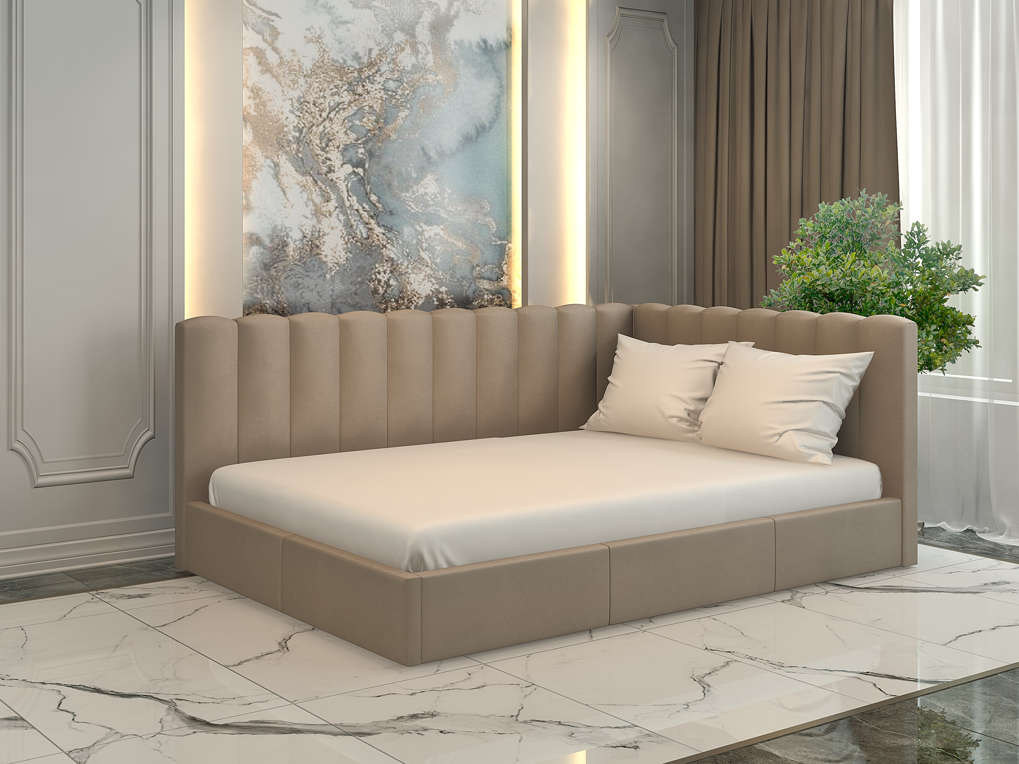 Для просторих кімнат чудово підійдуть моделі з масивним узголів’ям або декоративними елементами — вони стануть акцентом інтер'єру.
