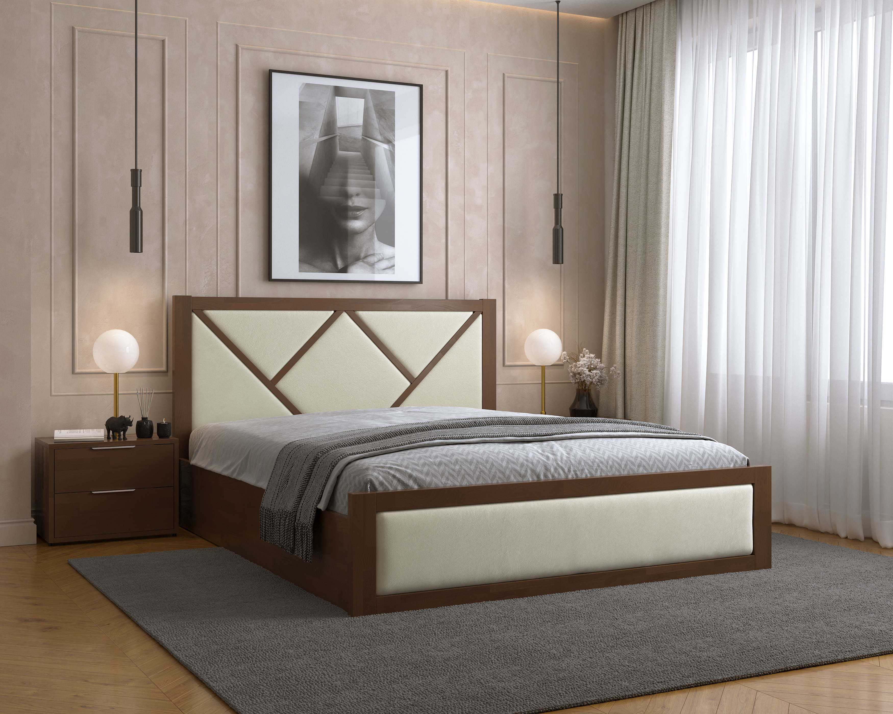 Для просторих кімнат чудово підійдуть моделі з масивним узголів’ям або декоративними елементами — вони стануть акцентом інтер'єру.