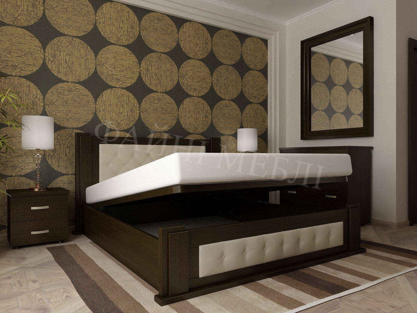 - Основа під матрац. У комплектації з підйомним механізмом використовується ортопедична металева рама, що додає підтримки та продовжує термін служби матраца. У версії без механізму передбачені гнутоклеєні ламелі, які не лише витримують великі навантаження, а й сприяють природній циркуляції повітря.