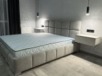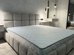 - Габарити. Загальна довжина та ширина ліжка збільшені на 25 см відповідно до розмірів спального місця, що забезпечує пропорційний вигляд та візуальну рівновагу у кімнаті. Висота узголів’я – 110 см – робить акцент у зоні відпочинку, надаючи їй відчуття завершеності та структури.