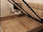 - Ніша для зберігання. Підйомний механізм відкриває доступ до місткого короба для речей – практичного рішення для організації зберігання постільної білизни, пледів, сезонного одягу або інших предметів побуту. Це дає змогу ефективно використовувати простір, зменшуючи потребу у додаткових шафах.