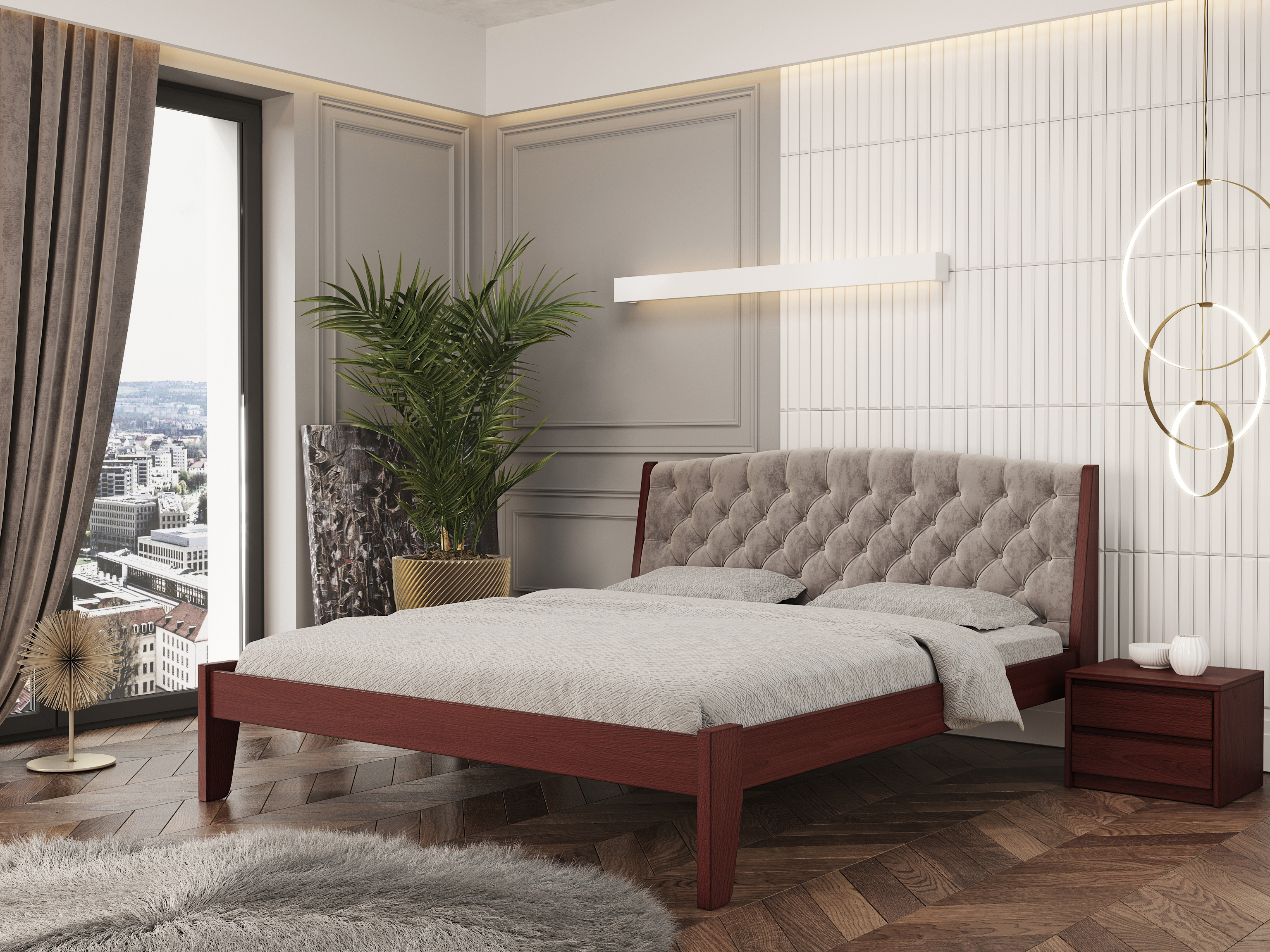 Для просторих кімнат чудово підійдуть моделі з масивним узголів’ям або декоративними елементами — вони стануть акцентом інтер'єру.
