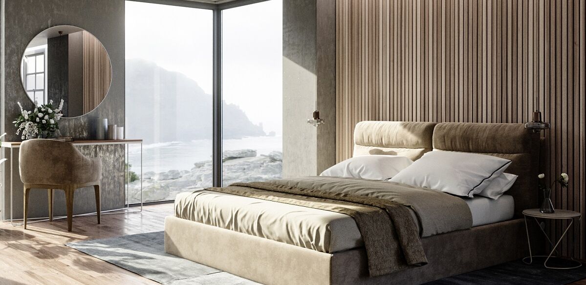 Для просторих кімнат чудово підійдуть моделі з масивним узголів’ям або декоративними елементами — вони стануть акцентом інтер'єру.