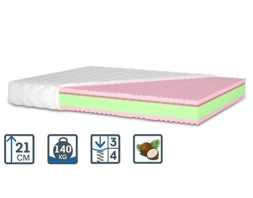 | Матрац двосторонній Різна жорсткість сторін Жоркість сторони 1: середня Жорсткість сторони 2: вище середньої Висота: до 21 см Рекомендоване навантаження: до 140 кг на спальне місце | Внутрішнє наповнення: Піна Oxigen Foam Кокос Natural Foam - екологічний матеріал Піна Oxigen Foam Чохол:стрейч-жаккард | |