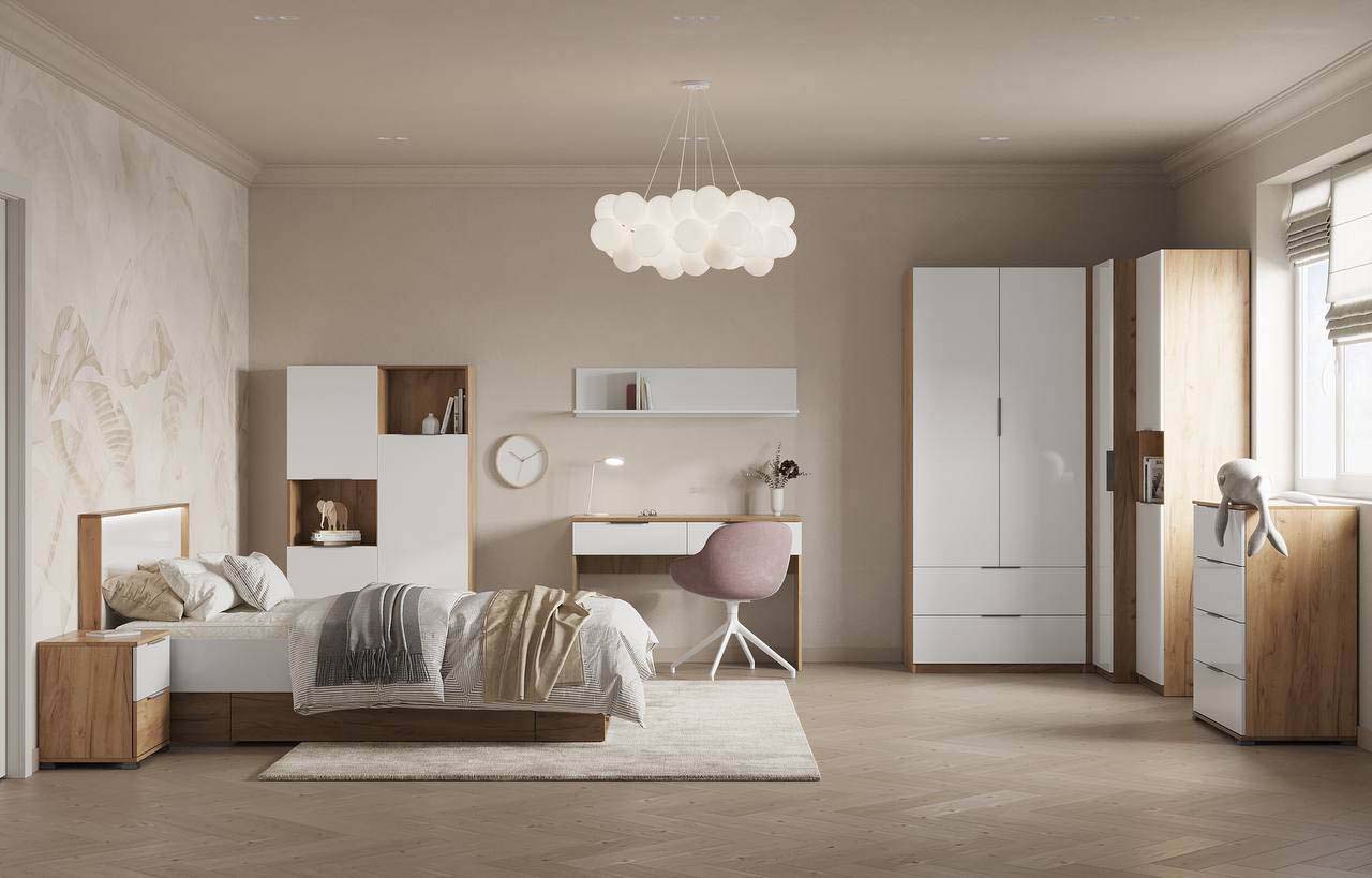 Корпус і фасади модульної дитячої Асті Джуніор виготовлені з якісного ЛДСП у поєднанні кольорів Дуб крафт / Глянець білий, що створює світлий і затишний настрій у кімнаті. Телескопічні напрямні повного висуву забезпечують плавну та зручну роботу шухляд, а металеві ручки додають меблям сучасного характеру. Комплектація продумана до дрібниць: ліжко для комфортного відпочинку, письмовий стіл для навчання, туалетний столик для особистого простору та місткі пенал і комод для зберігання речей. Навісна полиця і приліжкова тумба допомагають раціонально організувати простір, роблячи кімнату охайною та функціональною.