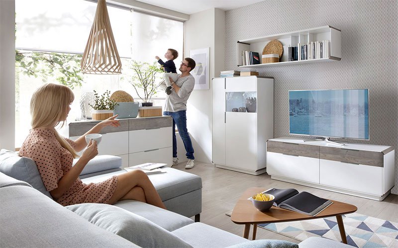 Модульна вітальня Аліса, виглядає лаконічно завдяки поєднанні світлого та досить насиченого, темного дерева.