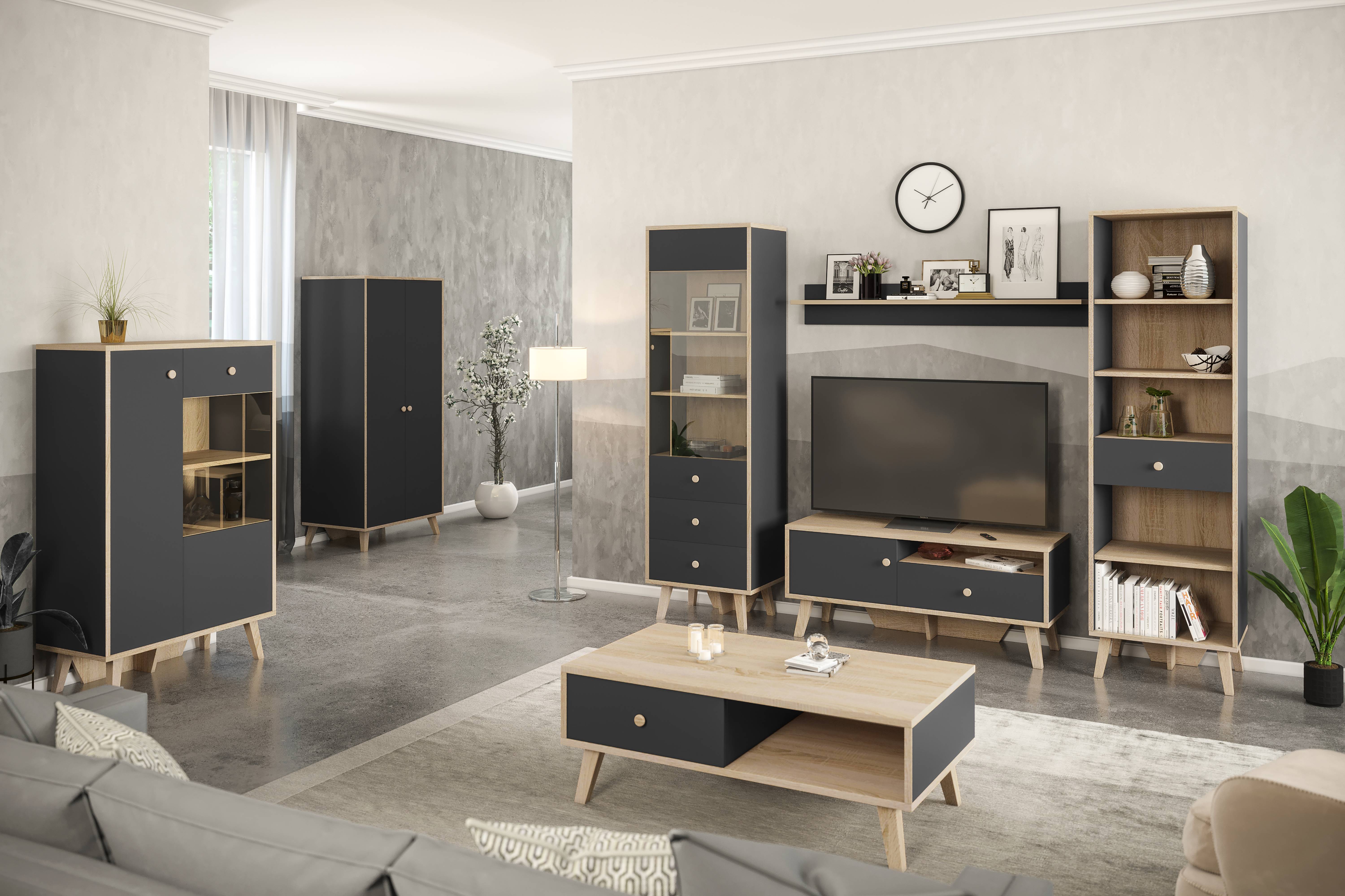 Широкий вибір модулів дозволяє створювати індивідуальні композиції: від компактних рішень до масштабних систем зберігання.Завдяки різноманіттю модулів колекцію можна адаптувати до будь-якого розміру кімнати та стилю інтер’єру. - Стриманий сучасний стиль. Колір антрацит з текстурою дуба сонома, прямі форми створюють естетику мінімалізму з характером.