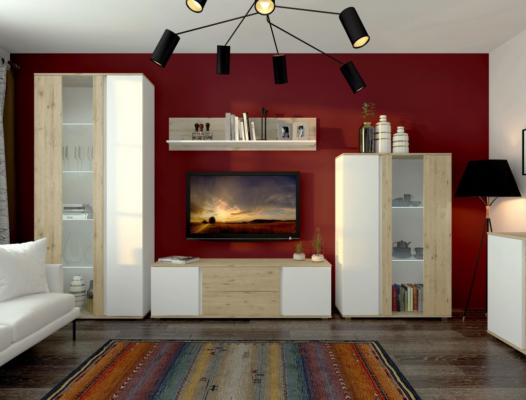 Система Герда виробляється з високоякісного МДФ , що забезпечує стабільність форми, стійкість до зносу й привабливий вигляд. Модулі комплекту можуть включати тумбу під телевізор, вітрину, навісні полиці, комод, шафа — ви самі обираєте конфігурацію вашого простору.