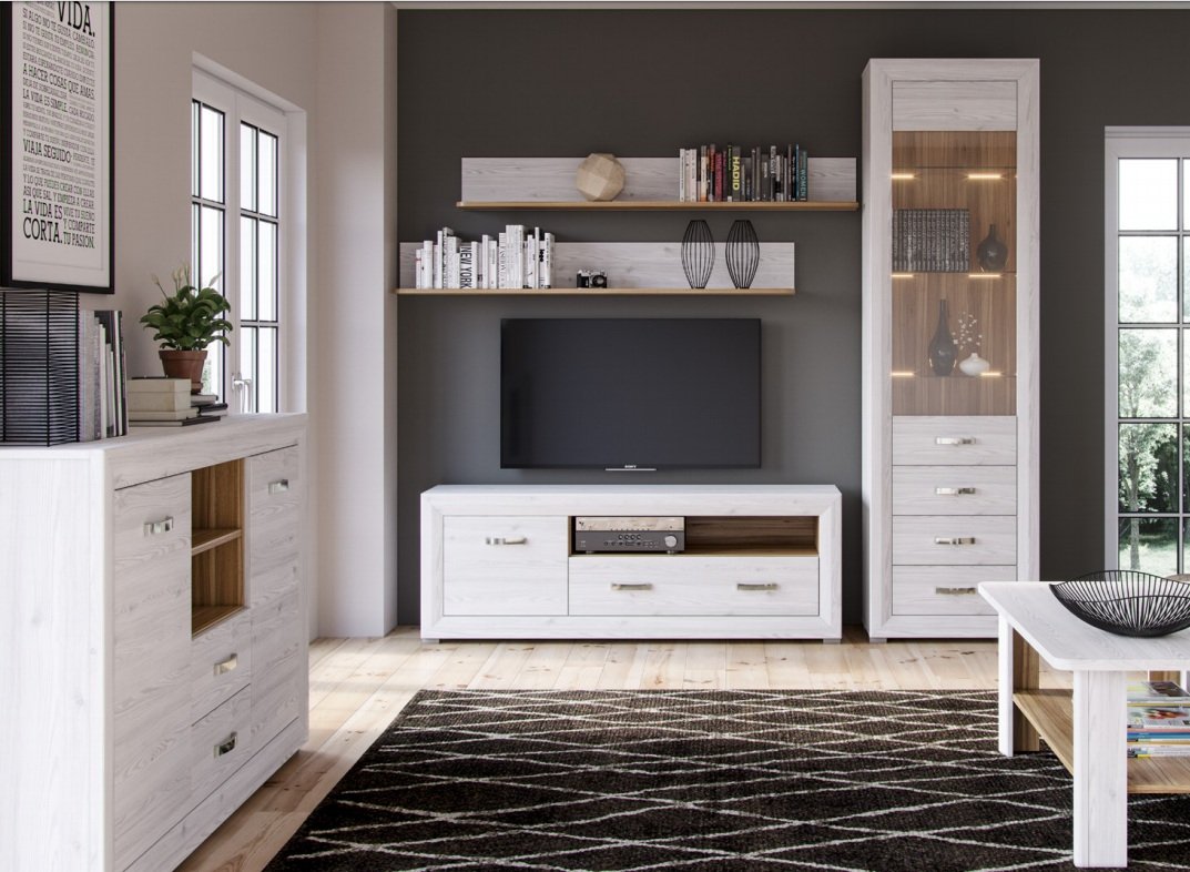 Система Malta виробляється з високоякісного ламінованого ДСП, що забезпечує стабільність форми, стійкість до зносу й привабливий вигляд. Металеві ручки додають стилю і міцності. Модулі комплекту можуть включати вітрина, ТВ тумби, комод, журнальний стіл — ви самі обираєте конфігурацію вашого простору.