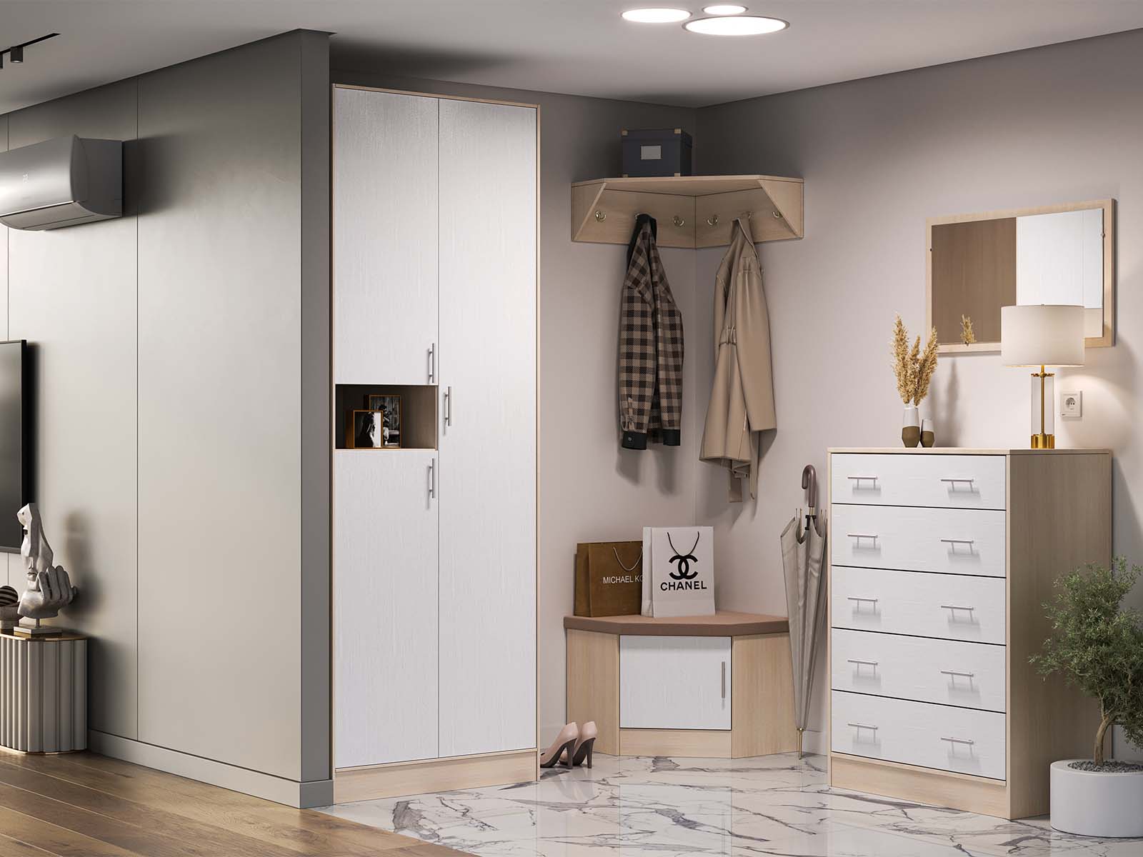 Система дозволяє самостійно формувати конфігурацію передпокою, підлаштовуючи меблі під розміри приміщення та індивідуальні потреби. - Світла універсальна кольорова гама