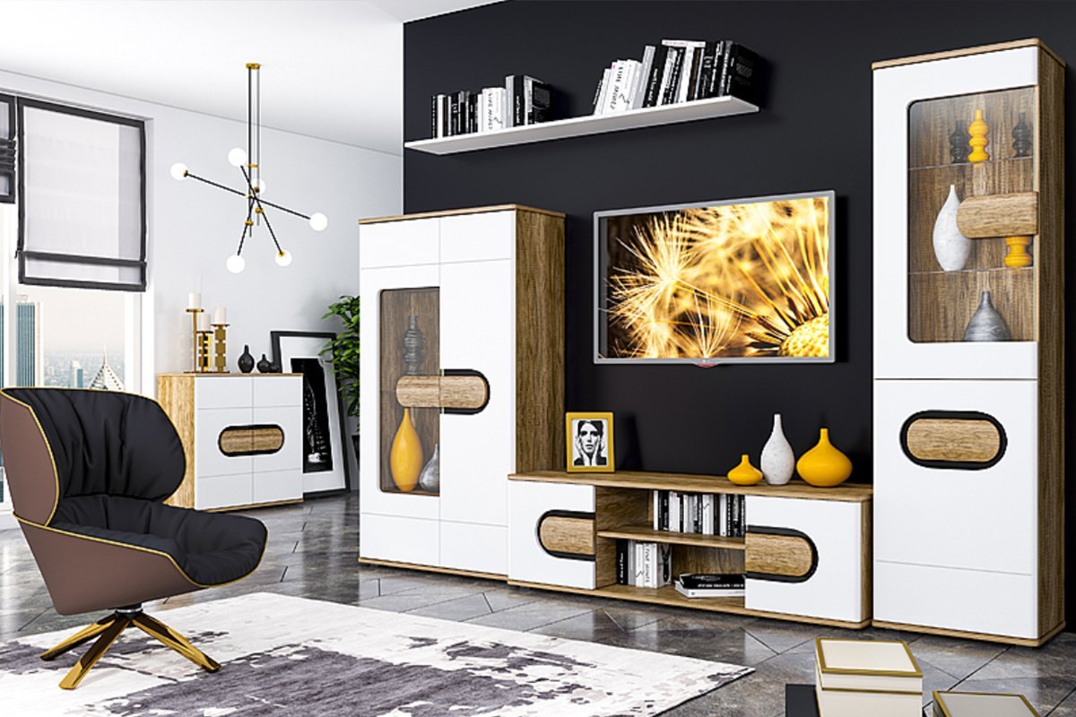Система RODAN виробляється з високоякісного МДФ, що забезпечує стабільність форми, стійкість до зносу й привабливий вигляд. Модулі комплекту можуть включати ТВ тумбу, журнальний стіл, шафи, полички, комоди, вітрини — ви самі обираєте конфігурацію вашого простору.