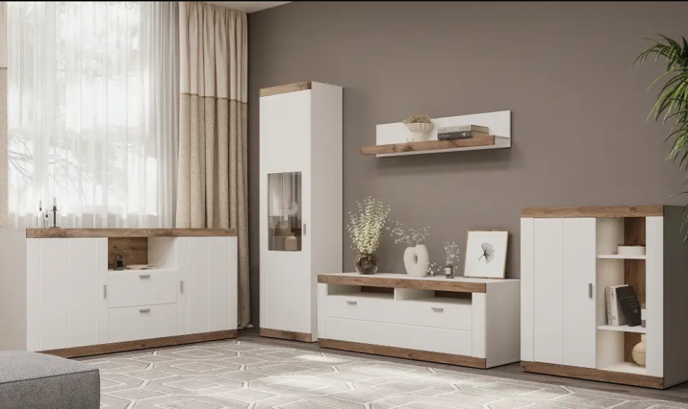 Система Санторіні виробляється з високоякісного ламінованого ДСП , що забезпечує стабільність форми, стійкість до зносу й привабливий вигляд. Металеві ручки додають стилю і міцності. Модулі комплекту можуть включати тумбу під телевізор, полиця, вітрини, комоди — ви самі обираєте конфігурацію вашого простору.