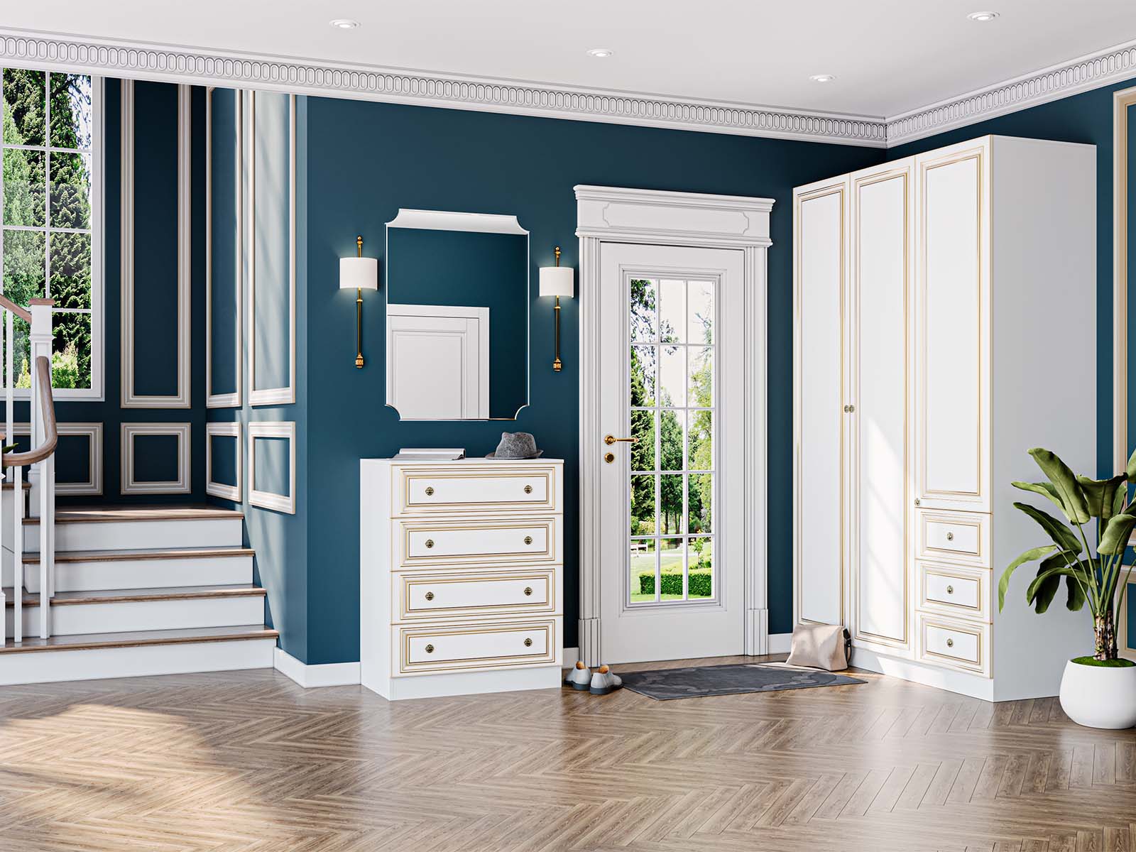 Золота патина та декоративна фреза створюють образ розкішного передпокою з «королівським» характером. - Світла тепла кольорова гама