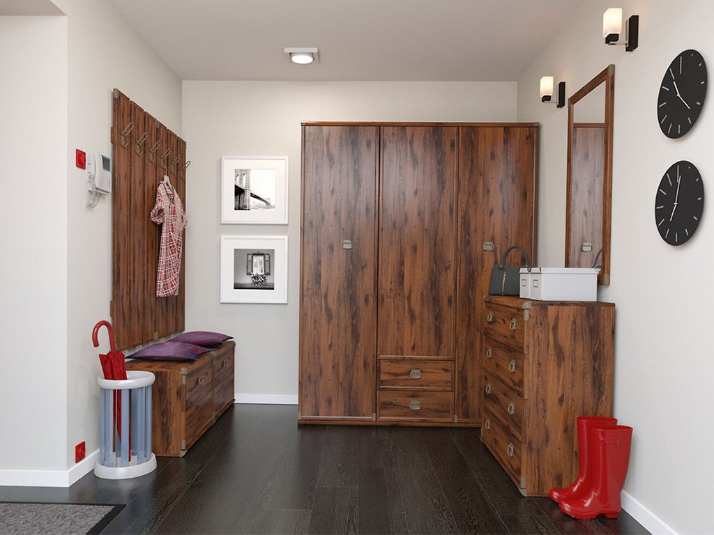 Корпус модульного передпокою Монтана виготовлений із якісної ДСП, а фасади - з ДСП в поєднанні з рамками з МДФ, що забезпечує міцність, стабільність форми та довговічність. Верхня поверхня з МДФ додає конструкції надійності та візуальної завершеності. Закруглені краї верхніх і нижніх кутів роблять масивні елементи більш ергономічними та безпечними у користуванні. Дизайн доповнений металевими ручками з тьмяним мідним блиском та декоративними металевими куточками, які підсилюють стилістику дикого заходу. Для комфортної експлуатації використовується німецька фурнітура HETTICH, що гарантує надійність і плавну роботу елементів. До складу модульної системи можуть входити: два варіанти тумб, вішак, скриня, дві моделі шаф, комод та дзеркало. Колекція виконана в кольорі Дуб шуттер. Комплект постачається з інструкцією та повним набором фурнітури для монтажу.