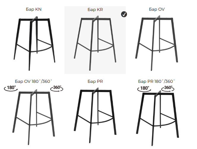 Каркас стула выполнен из прочного металла с покрытием устойчивой порошковой краской, которая защищает от коррозии и царапин. Сиденье выполнено из мягкого, приятного на ощупь материала — ткани или велюра высокой плотности, сохраняющего форму даже при длительном использовании. Обивка легко очищается, не выгорает на солнце и обладает повышенной износостойкостью. Стандартная опора бар KR.