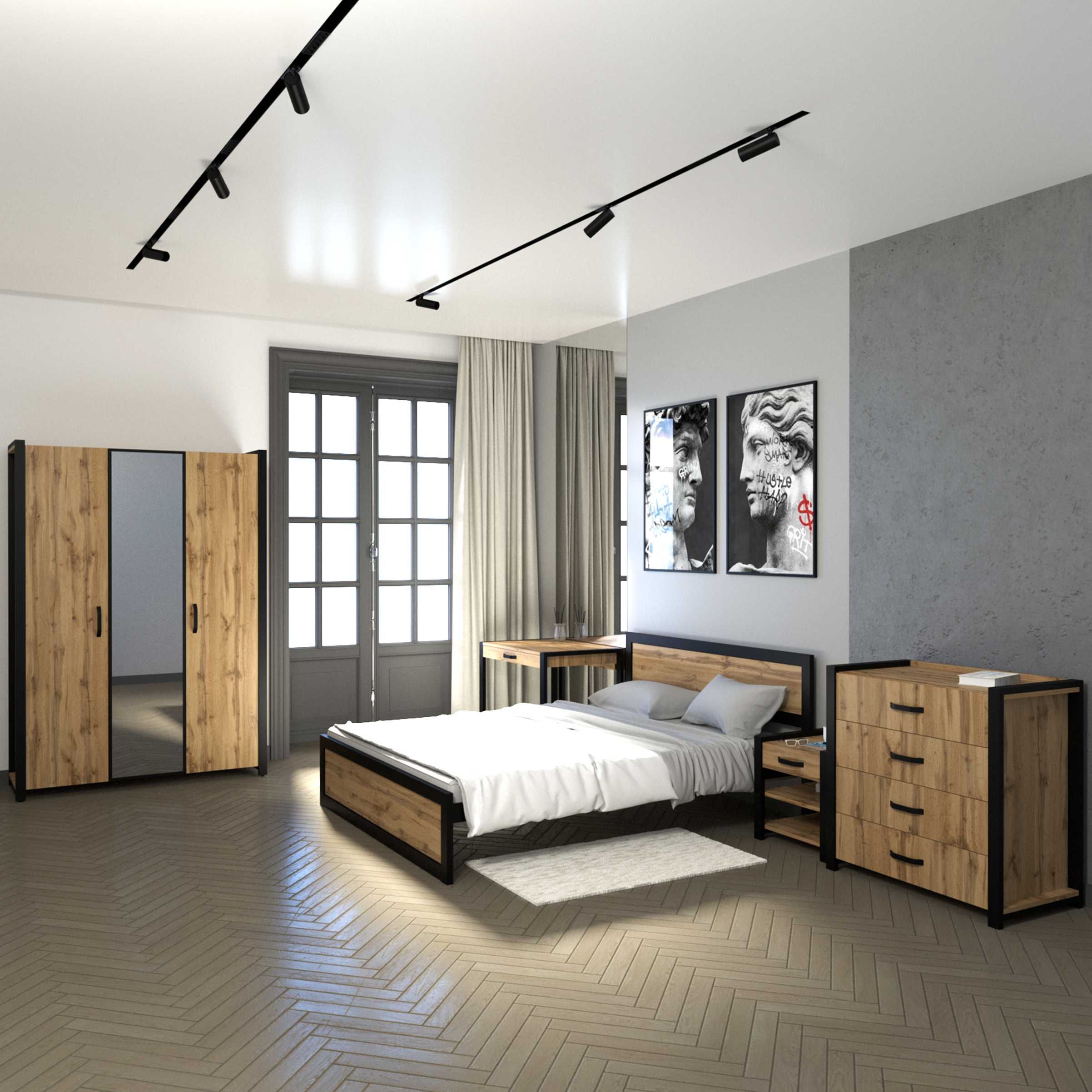 Спальня LOFT изготовлена из сочетания надёжного металла и практичного ЛДСП: прочный металлический каркас обеспечивает устойчивость конструкции, а корпус и фасады из ЛДСП придают долговечность, износостойкость и аккуратный современный внешний вид мебели. Большая вариация цветов: Дуб Сонома / Белый мат, Дуб Сонома / Чёрный мат, Дуб Тахо / Белый мат, Дуб Тахо / Чёрный мат, Индастриал / Чёрный мат, Оксид / Белый мат, Оксид / Чёрный мат, Индастриал / Белый мат.